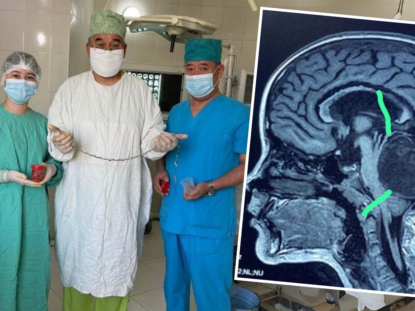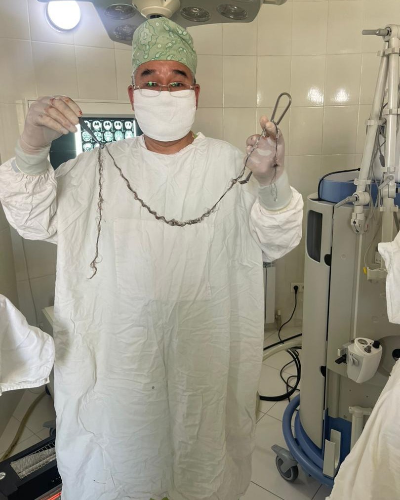Ärzte im Jal-Krankenhaus in Bischkek führten eine außergewöhnliche Operation durch, bei der sie eine meterlange Haarlocke aus dem Gehirn eines achtjährigen Mädchens entfernten. Das medizinische Team, angeführt von Dr. Mitalip Mamytov, war überrascht, als sie feststellten, dass die im MRT sichtbare Masse vollständig aus Haaren bestand.