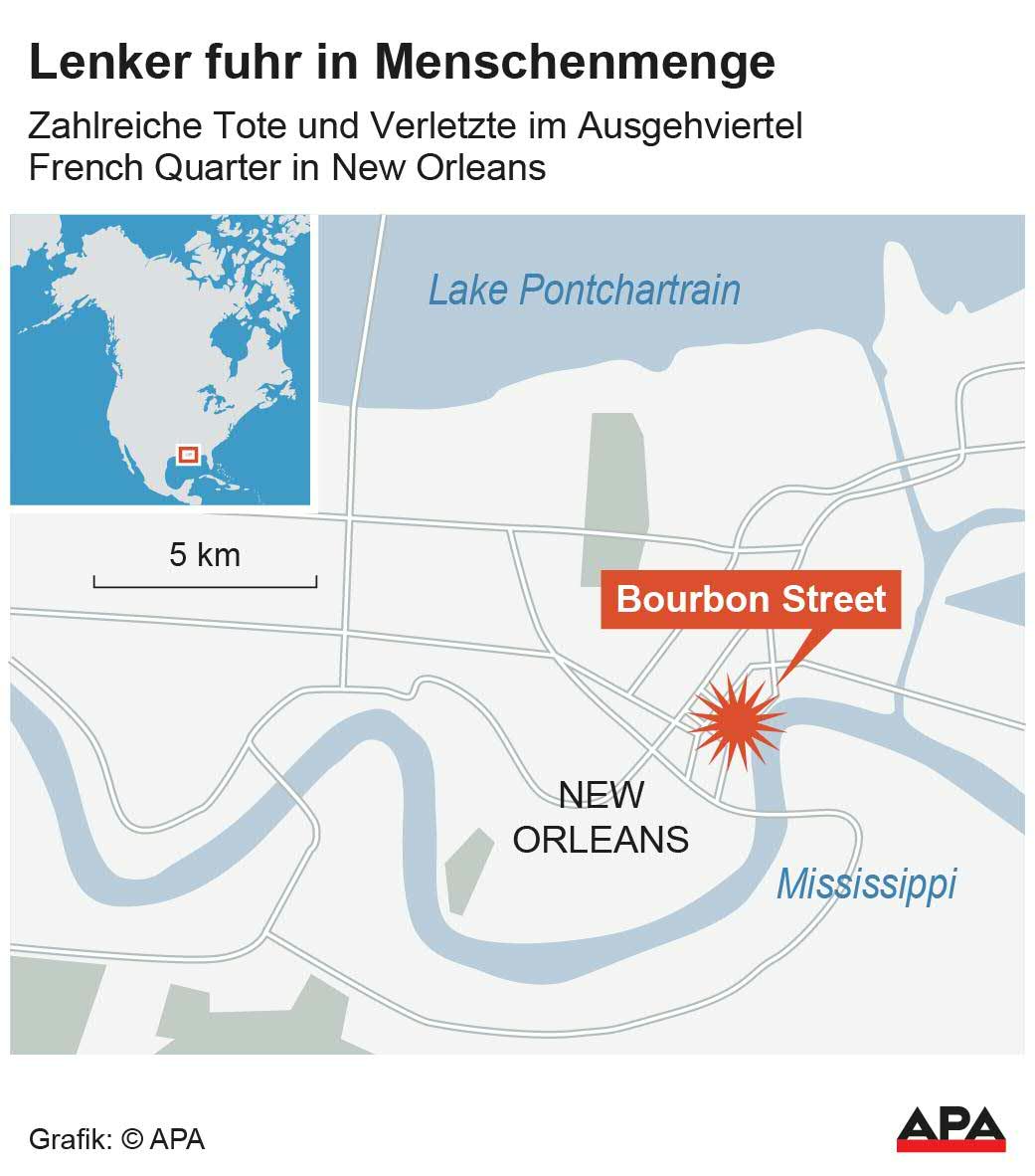 Mindestens 15 Menschen starben in der Silvesternacht, als ein Täter in Feiernde im beliebten Ausgehviertel French Quarter raste. In seinem Wagen wurde eine Flagge der Terrororganisation Islamischer Staat (IS) gefunden. Außerdem befanden sich im Fahrzeug laut FBI Waffen. Auch mögliche Sprengsätze wurden im und außerhalb des Wagens entdeckt. Zunächst war auch unklar, ob der Täter Komplizen hatte.