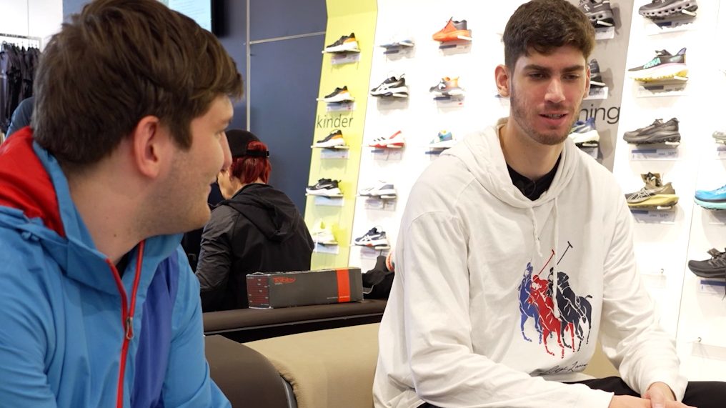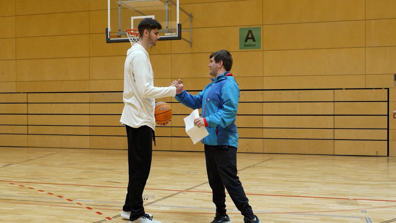 Zum Abschluss begleiteten wir den 2,20 Meter großen Center in die Messe-Ballsporthalle. ©Ländle TV