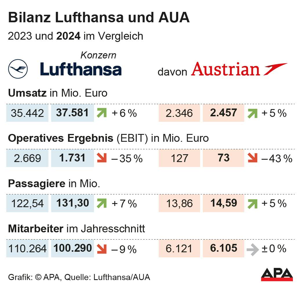 Ziel sei es, so Mann, das "Vorjahresergebnis signifikant zu übertreffen". 2024 erlitt die AUA einen Gewinneinbruch um 40 Prozent auf 76 Mio. Euro. Ein Unsicherheitsfaktor sei allerdings die aktuelle geopolitische Lage in wichtigen Kernmärkten der Airline, hieß es in der Pressemitteilung.