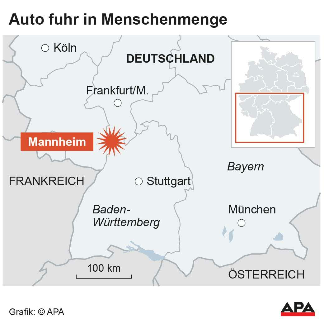 In der Mannheimer Innenstadt kamen nach Angaben der Polizei am Rosenmontag zwei Menschen ums Leben, fünf Menschen wurden schwer, fünf leicht verletzt. Der Autofahrer, ein 40-jähriger Deutscher aus Rheinland-Pfalz, wurde festgenommen und liegt verletzt im Krankenhaus. Die Ermittler gehen nicht von einem politischen Hintergrund aus.
