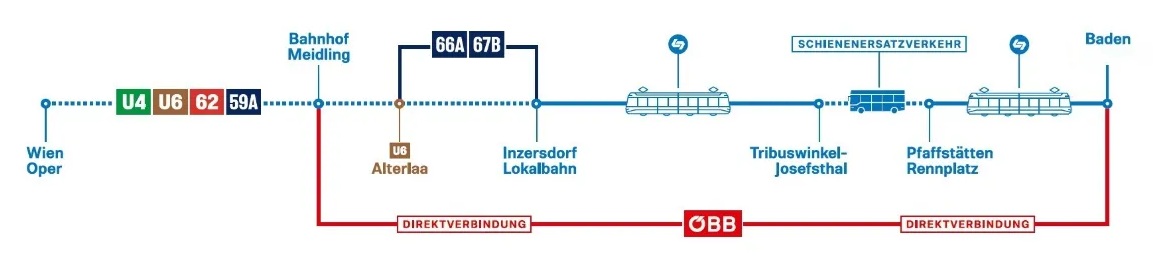 The sections from Vienna Oper to Inzersdorf Lokalbahn and from Tribuswinkel-Josefsthal to Pfaffstätten Rennplatz will not be served. A rail replacement service with buses has been set up for the affected southern section. Transfers take place directly at the stops.