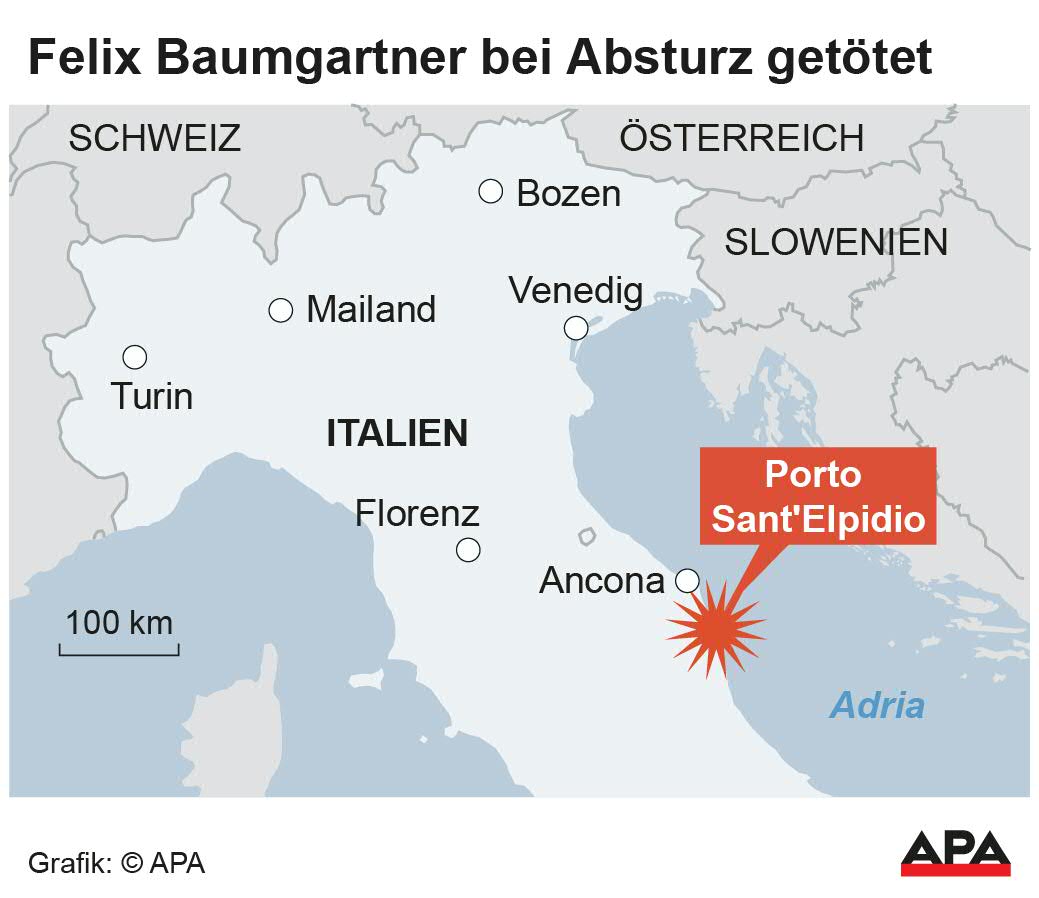 Felix Baumgartner verlor am Mittwoch bei einem Paragliding-Flug an der Adriaküste sein Leben. Er stürzte auf das Gelände des Camping-Hotels Le Mimose, rund zwei Kilometer vom Zentrum von Porto Sant’Elpidio entfernt. Die Ferienanlage erstreckt sich über 30.000 Quadratmeter.