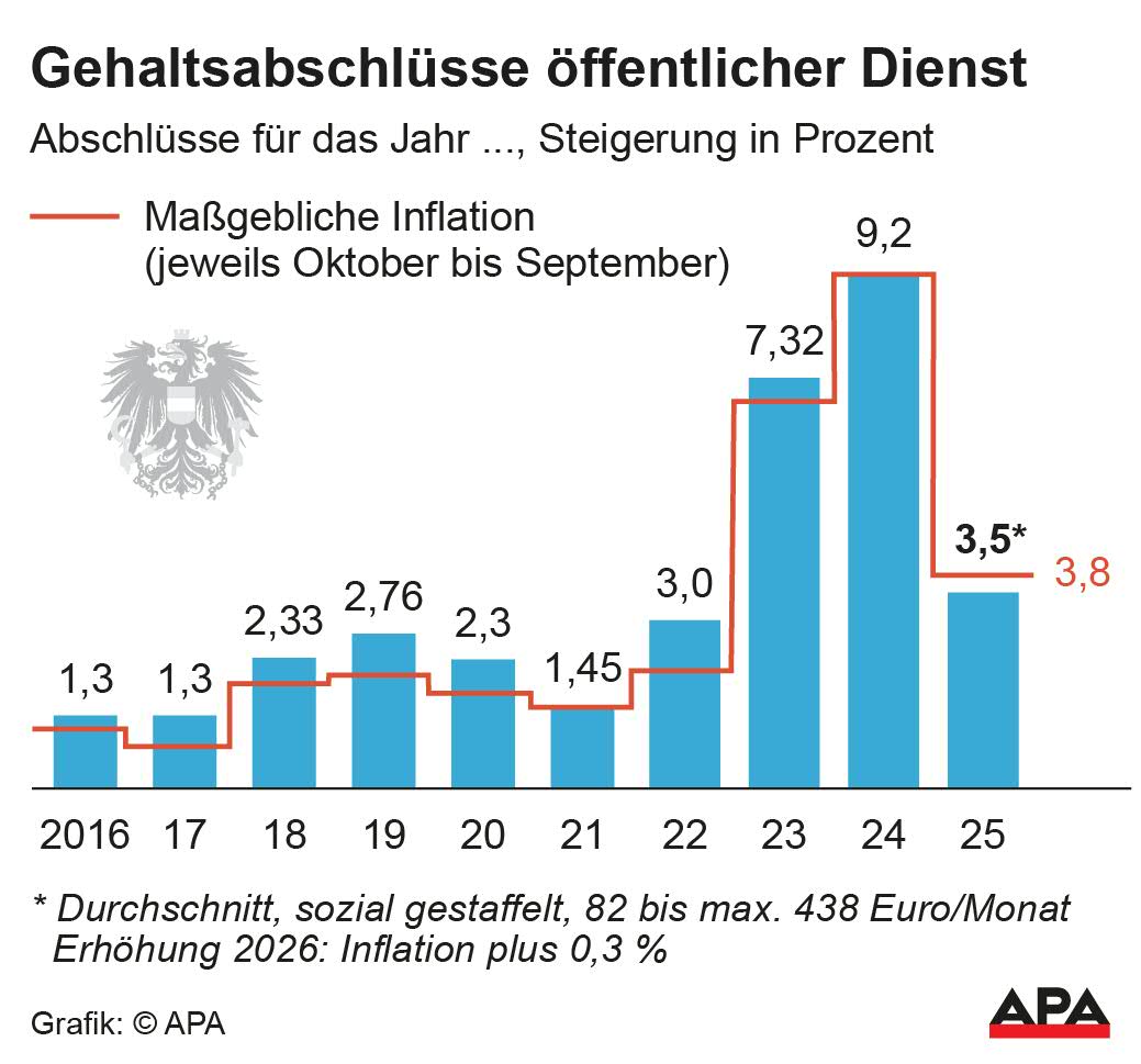 In einem "X"-Posting der Gewerkschaft Öffentlicher Dienst (GÖD) hieß es am Donnerstag: "Der Gehaltsabschluss ist beschlossen und gilt." Die Vereinbarung sieht vor, dass für 2026 die Gehälter 0,3 Prozent über der Inflation angepasst werden, nachdem sie für heuer um denselben Wert unter der Teuerung erhöht wurden.