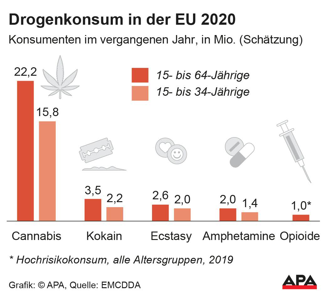 Mit Abstand am häufigsten wurde laut den Schätzungen der EU-Drogenbeobachtungsstelle EMCDDA im Jahr 2020 in der Europäischen Union neuerlich Cannabis konsumiert. 22,2 Millionen EU-Bürger im Alter von 15 bis 64 Jahren griffen zu Marihuana oder Haschisch. Das sind 7,7 Prozent der 15- bis 64-Jährigen, bei den Unter-35-Jährigen sogar 15,4 Prozent (15,8 Millionen Konsumenten). Die Werte für Österreich in dem Bericht lagen leicht darunter, stammten jedoch aus dem Jahr 2015.