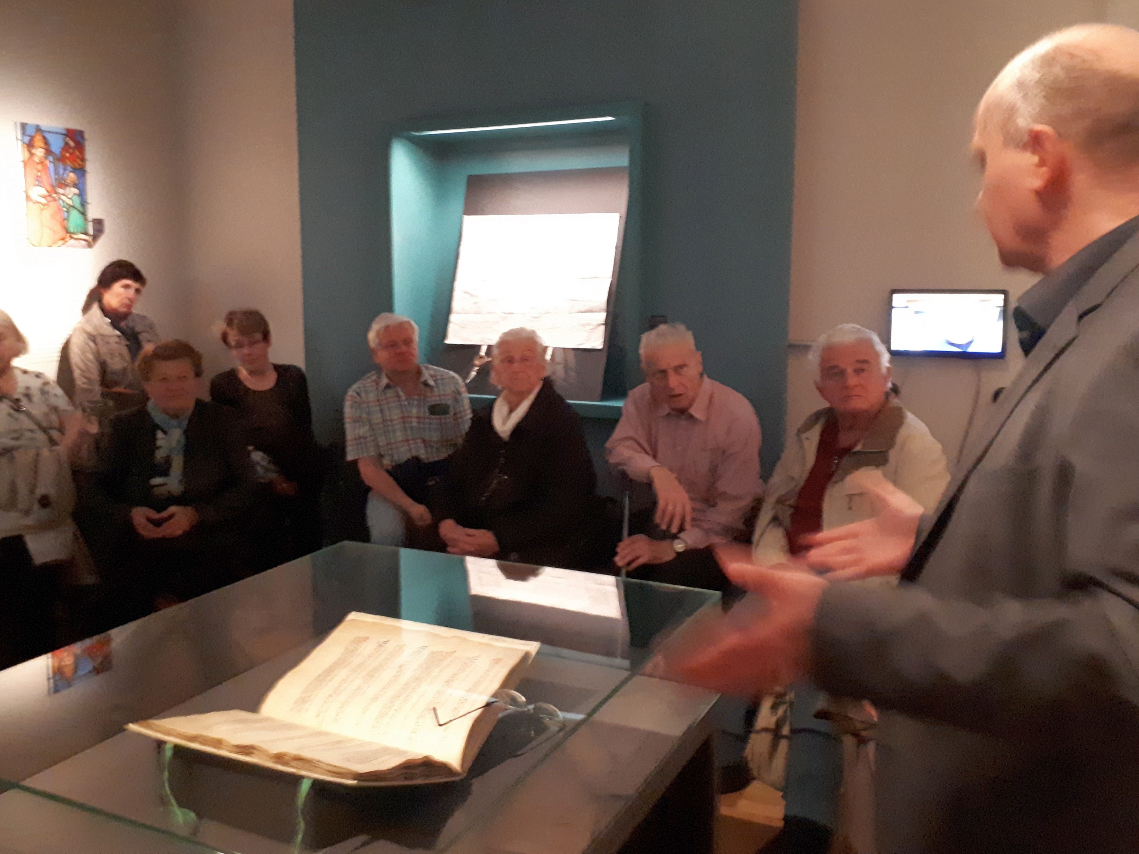 Dr. Hans Gruber, der Kurator der Ausstellung ließ es sich nicht nehmen, unsere Ortgruppe selbst durch das Palais Liechtenstein zu führen. Wissenschaftlich ist Georg Joachim Rhetikus ein Beispiel. Buchdruck und Studierstadt erheben die Stadt zum Humanismus. Feldkirch war in der NS-Zeit die Grenzstadt, viele Flüchtlinge erhofften hier Freiheit. Ein aktueller Bezug zu Heute! Hochwasser und Stadtbrand waren furchtbare Katastrophen. Schönes ist in dieser Ausstellung im Palais Liechtenstein auch zu erfahren. Ein altes Klaviere und hochwertige alte Bücher zeugen von der kulturellen und wissenschaftlichen Bedeutung. Im Spätmittelalter waren hier mehr Gelehrte als in Rom.