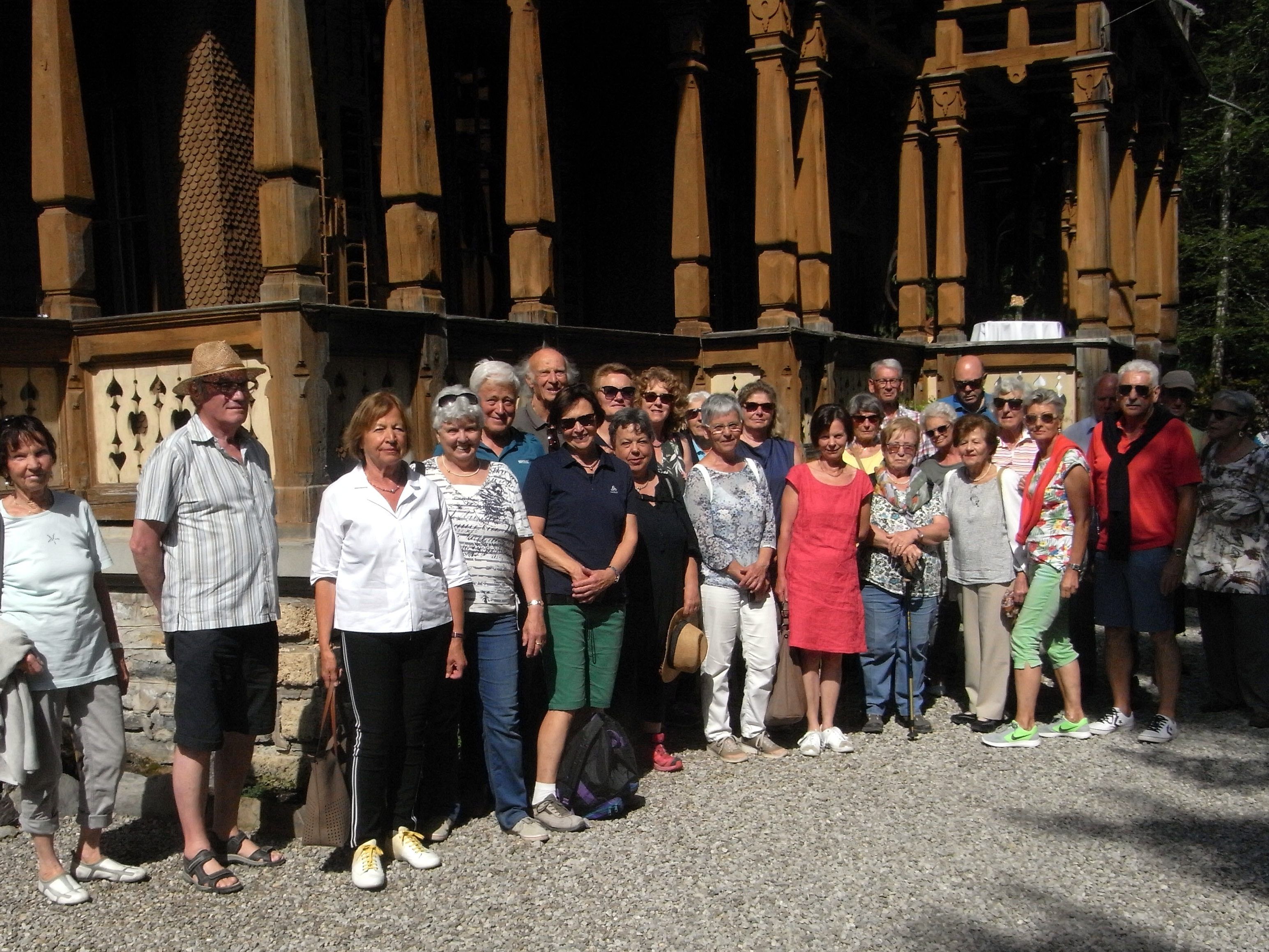 Bei herrlichem Wetter führte die Busfahrt in den schönen Bregenzerwald nach Schoppernau. Vorstandsmitglied und Touristikerin Gudrun Schedler hieß die Gäste willkommen und gab wertvolle Hinweise über den Bregenzerwald, die Auer Barockbaumeister und Franz Michael Felder. Dann ging es per Shuttlebus oder einer kurzen Wanderung über die idyllischen Vorsäßalpen Hopfreben zur historischen Villa Maund. Dort wurden die Besucher mit einem Glas Sekt vor dem einzigartigen Anwesen mit seiner außergewöhnlichen Architektur empfangen.