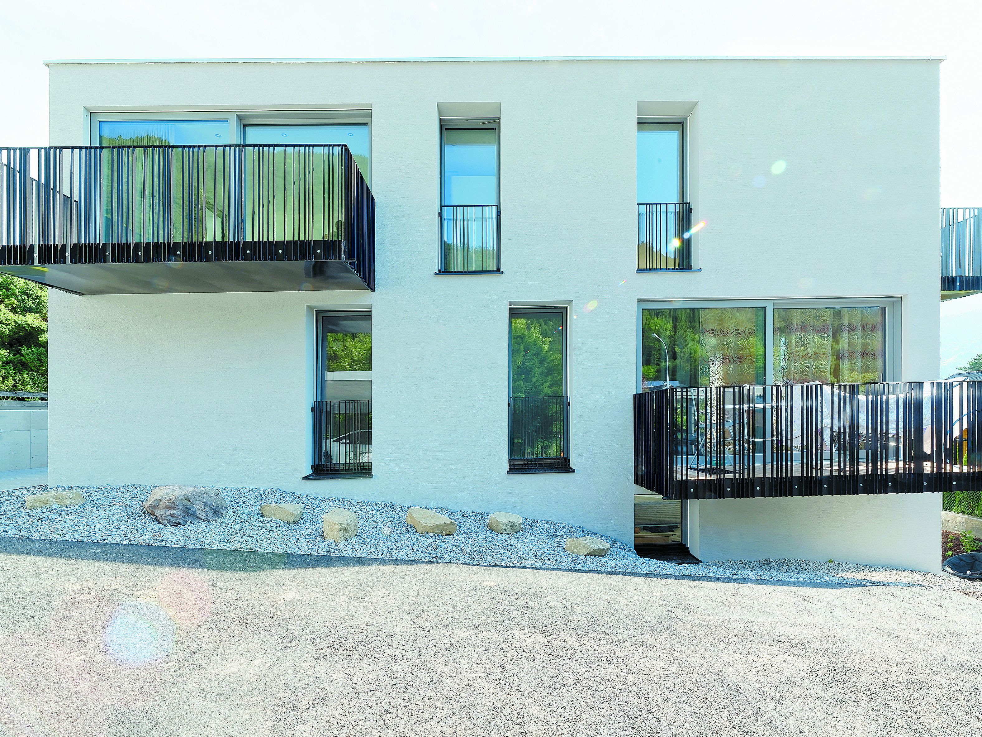 Die mögliche Dichte komplett ausschöpfend, umfasst die am dicht bebauten Sonnenhang von Nüziders auf einem nur 818 Quadratmeter großen Grundstück angelegte Anlage sechs Einheiten zwischen 53 und 90 Quadratmetern. Gebaut auf drei Ebenen rund um einen durch alle Ebenen durchgehenden betonierten Funktionskern. Aus Stahlbeton sind auch die Böden und Decken, während die Außenwände aus gedämmten Ziegeln konventionell gemauert und deshalb ohne zusätzliche Wärmedämmung direkt hellgrau verputzt sind.