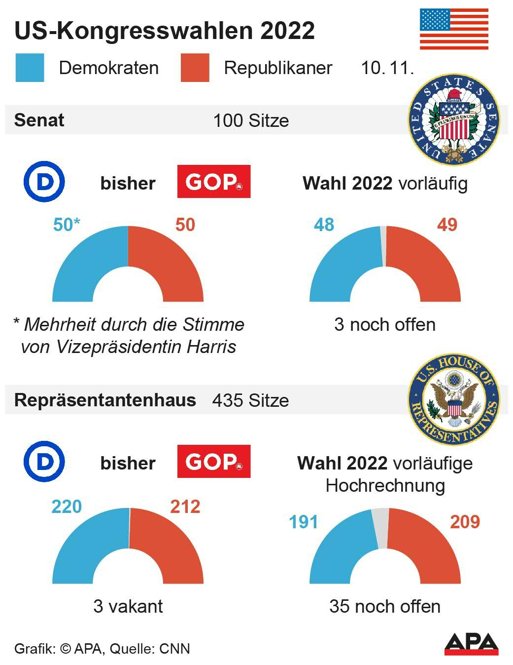 Bei den Zwischenwahlen in der Mitte von Bidens Amtszeit war am Dienstag unter anderem über alle 435 Sitze des Repräsentantenhauses und gut ein Drittel der Senatssitze abgestimmt worden. Weder die Republikaner noch die Demokraten kommen nach bisherigem Stand der Prognosen und Ergebnisse zu den einzelnen Rennen in den Bundesstaaten jedoch auf die Mehrheit der Sitze in Senat und Repräsentantenhaus.