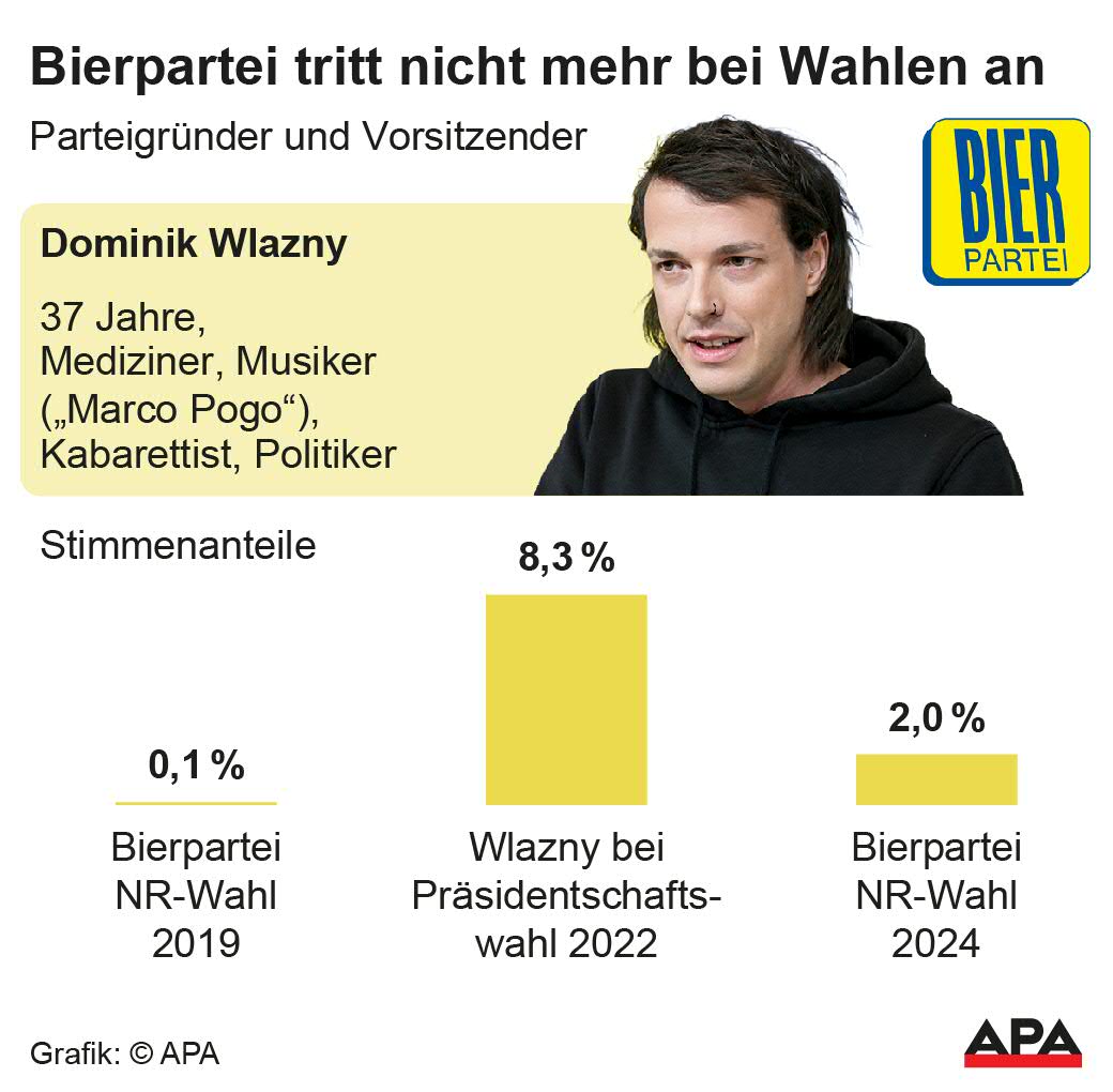 "Die Bierpartei wird nicht bei der kommenden Wahl in Wien antreten, und auch bei keiner anderen Wahl", sagte Wlazny in einem auf Youtube veröffentlichten Statement. "Wir schließen das Kapitel als politische Partei im klassischen Sinn, und machen anders weiter. Back to the roots quasi", so der Musiker der Band "Turbobier". "Wir bleiben kritisch, was wir immer waren, wir bleiben wachsam, und das ist vor allem in Zeiten wie diesen dringend notwendig."