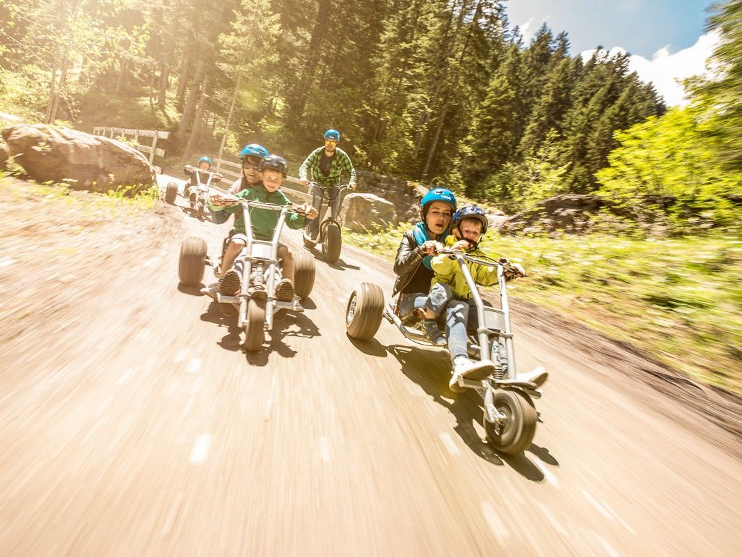 Auf drei Rädern ist der Downhillspaß für die ganze Familie zu haben. Mit Mountainkarts oder Monsterrollern geht es über eine mehr als drei Kilometer lange, anfängertaugliche Strecke auf der „Tschengla“ bergab. Die Mountainkarts mit drei Rädern und besonders tiefem Schwerpunkt garantieren Abfahrtsspaß pur. Für diejenigen die lieber auf zwei Rädern unterwegs sind, stehen „Monsterroller“ mit überdimensionalen Geländereifen zur Verfügung. Die Funsportgeräte und die dazugehörige Schutzausrüstung können direkt an der Talstation der Einhornbahn II abgeholt werden. Dann geht es mit dem Lift zur Bergstation des Sesselliftes – von hier aus startet die Abfahrt mit den Funsportgeräten. Entlang der markierten Schotterstraße geht es Richtung Talstation, um gleich in die nächste Runde zu starten!