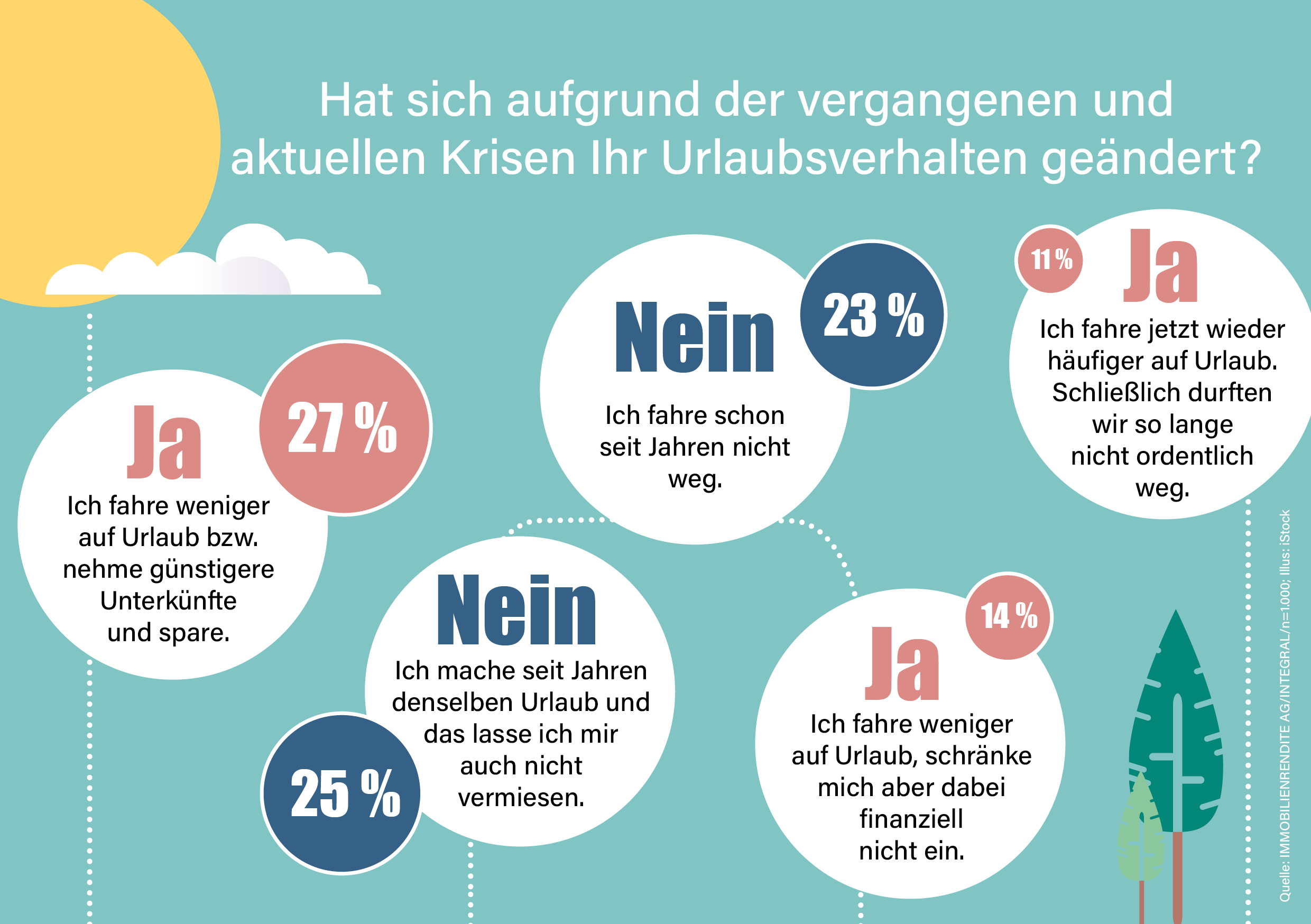 Die Folge ist eine Änderung des Ferienverhaltens. Das Ergebnis einer repräsentativen Online-Umfrage von INTEGRAL im Auftrag der IMMOBILIEN-RENDITE AG: unter 1.000 Österreichern zwischen 16 und 75 im März und April 2023.