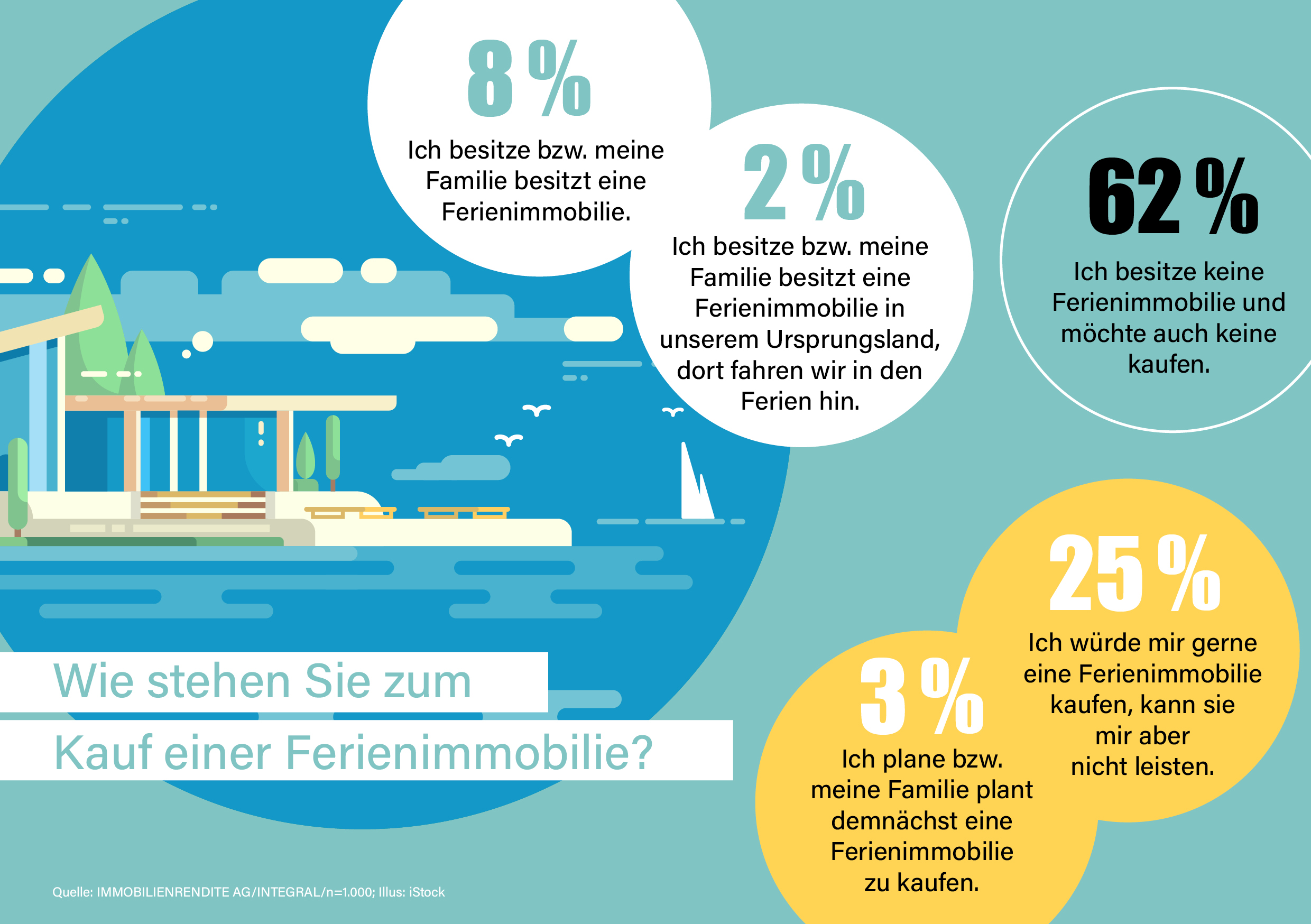 Eigene Ferienimmobilien sind in Österreich dünn gesät: Nur 10 Prozent besitzt eine. 8 Prozent selbst und 2 Prozent über die Familie in ihrem Ursprungsland. Weitere 3 Prozent planen demnächst einen Ankauf. Ein weiteres Viertel (25 Prozent) würde gerne eine Ferienwohnung erwerben, kann sich das aber nicht leisten. 62 Prozent der Befragten besitzen hingegen keine und planen auch keinen Kauf. Mathias Mühlhofer, Vorstand der IMMOBILIENRENDITE AG: „Österreich ist ein Land der Mieter – auch in punkto Urlaub. Wer keine Eigentumswohnung oder kein Haus an seinem Hauptwohnsitz besitzt, investiert natürlich auch in keine Immobilie für die Ferien.“ Vorstandskollege Markus Kitz-Augenhammer ergänzt: „Die heimische Politik bestraft Urlaubsimmobilien sogar: in Form der Ferien-Wohnsitzabgabe oder des Zweitwohnsitz-Verbots in vielen Bundesländern. Treffen wollte man Superreiche, die Einheimischen Grund und Boden wegkaufen. Zur Kasse gebeten werden allerdings viele, die von ihren Eltern oder Großeltern eine Wohnung geerbt haben, sie selber sanieren und infolge für (Kurz-) Urlaube nutzen. Finanzielle Freiheit sieht anders aus, sogar in punkto Ferien.“