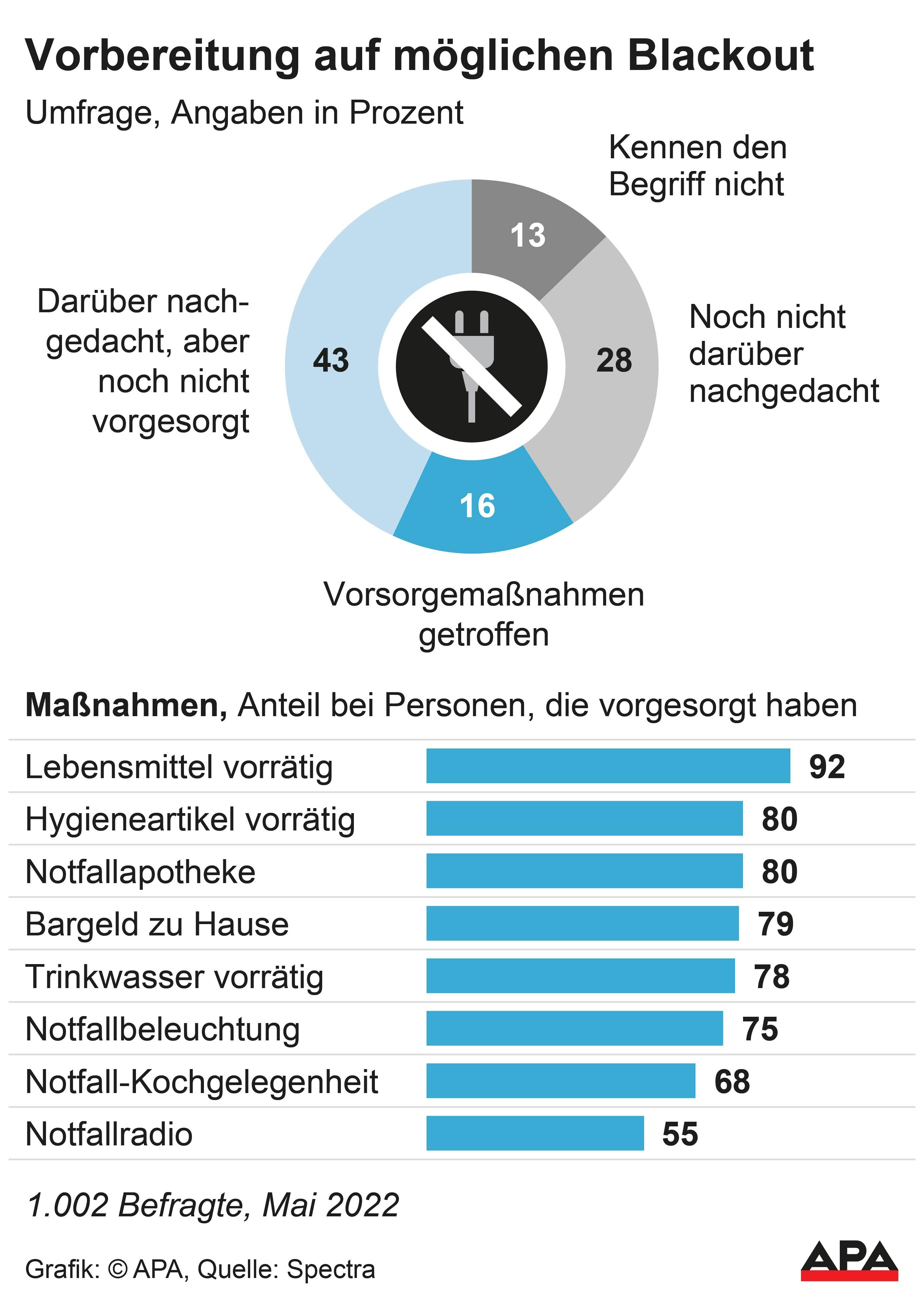 Spectra hat 1.002 repräsentativ für die österreichische Bevölkerung ab 15 Jahren ausgewählte Personen persönlich befragt. Immerhin 87 Prozent von ihnen gaben auf konkrete Nachfrage an, schon einmal gehört zu haben, dass mit einem Blackout ein länger andauernder Ausfall der Stromversorgung gemeint ist, von dem weite Teile des Landes betroffen sind. 61 Prozent fühlen sich sehr gut bzw. ausreichend über die Vorsorge und das Verhalten im Notfall informiert, ein gutes Viertel wenig bis gar nicht und 13 Prozent kennen nicht einmal den Begriff. 43 Prozent der Landsleute haben immerhin schon einmal darüber nachgedacht, für einen Blackout vorzusorgen, 28 Prozent haben sich noch keine Gedanken gemacht und lediglich 16 Prozent haben Vorsorgemaßnahmen getroffen.
