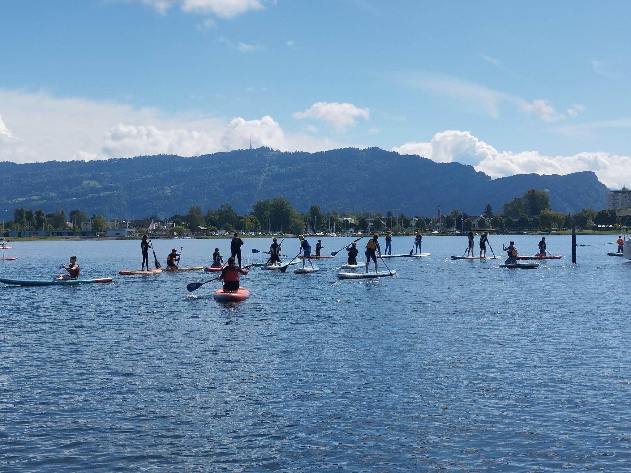 Die folgenden Tage erlebten die einzelnen Klassen jeweils für sich. An einem Tag konnten sich die Schüler:innen als Künstler:innen am See, am alten Rhein in Lustenau oder im Zeichensaal erleben. An einem anderen Tag wurde das Rheindeltahaus in Fußach besucht. Hier durfte eine Gruppe Molche fangen und bestimmen, andere nahmen an einer ornithologischen Führung im Rheindelta teil. Aufgrund des instabilen Wetters fuhren zwei Klassen mit dem Zug nach Lochau und erhielten während des herrlichen Spaziergangs an der Milli in Bregenz Geografieunterricht am Bodenseeufer. Nur der 2C war es vergönnt, den letzten Tag mit Stand Up Paddles auf dem See zu verbringen.