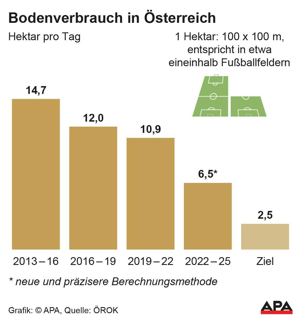 Die Flächeninanspruchnahme nahm in den vergangenen Drei-Jahres-Perioden folgendermaßen zu: 2013 bis 2016 um 14,7 Hektar pro Tag, 2016-2019 um zwölf Hektar pro Tag, 2019 bis 2022 um 10,9 Hektar pro Tag und 2022 bis 2025 mit etwas veränderten Berechnungsmethoden um 6,5 Hektar pro Tag (nach der alten Berechnungsart wären es hier 6,7 Hektar pro Tag). Ziel laut Bodenstrategie sind 2,5 Hektar pro Tag.