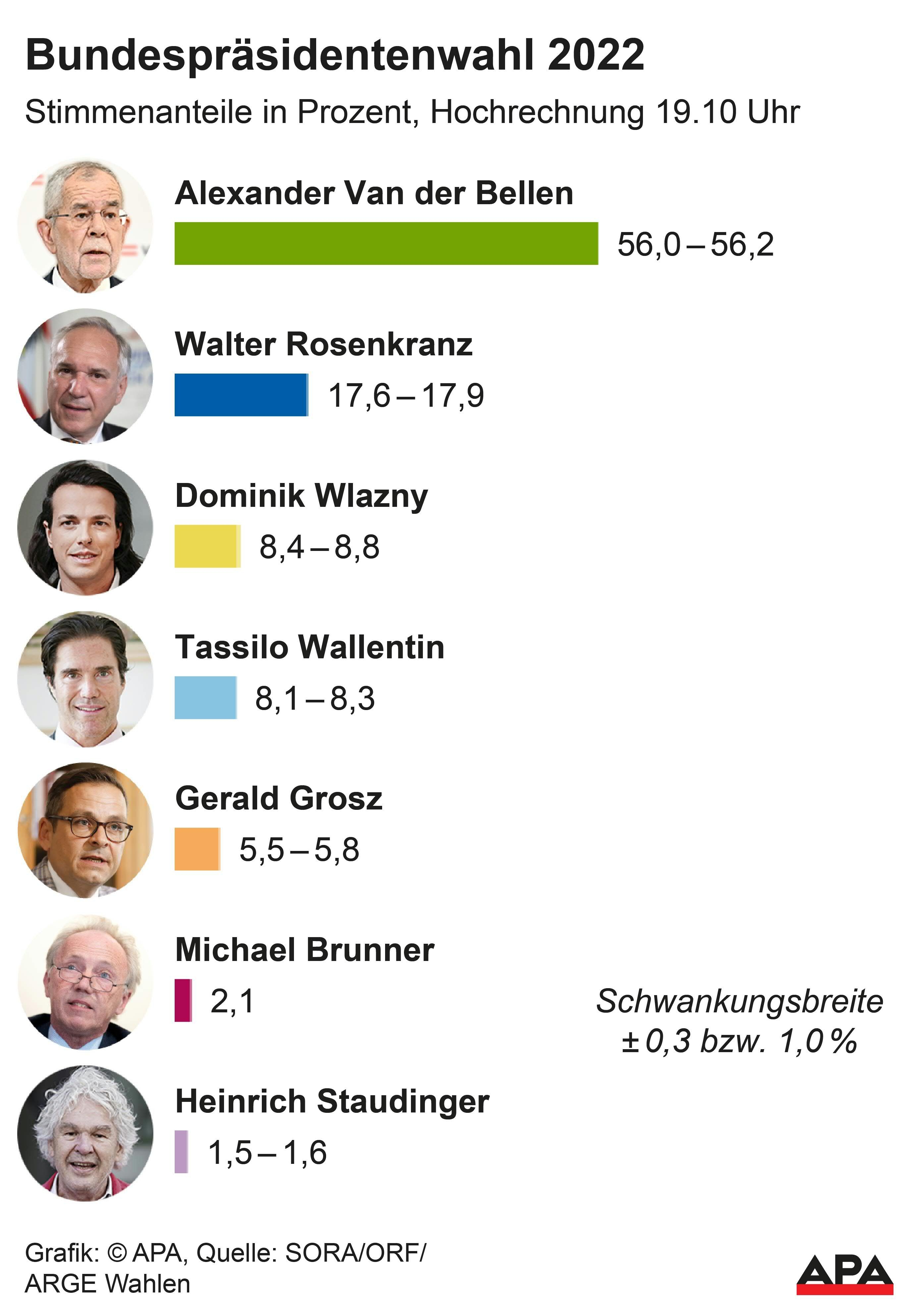 Bierpartei-Gründer Dominik Wlazny und Anwalt Tassilo Wallentin schwirren nach der Bundespräsidentenwahl 2022 rund um die acht Prozent, Blogger Gerald Grosz dürfte knapp sechs Prozent erreichen, MFG-Chef Michael Brunner gut zwei Prozent, Schuhfabrikant Heinrich Staudinger lag bei 1,5 Prozent. Die Wahlbeteiligung betrug rund zwei Drittel.