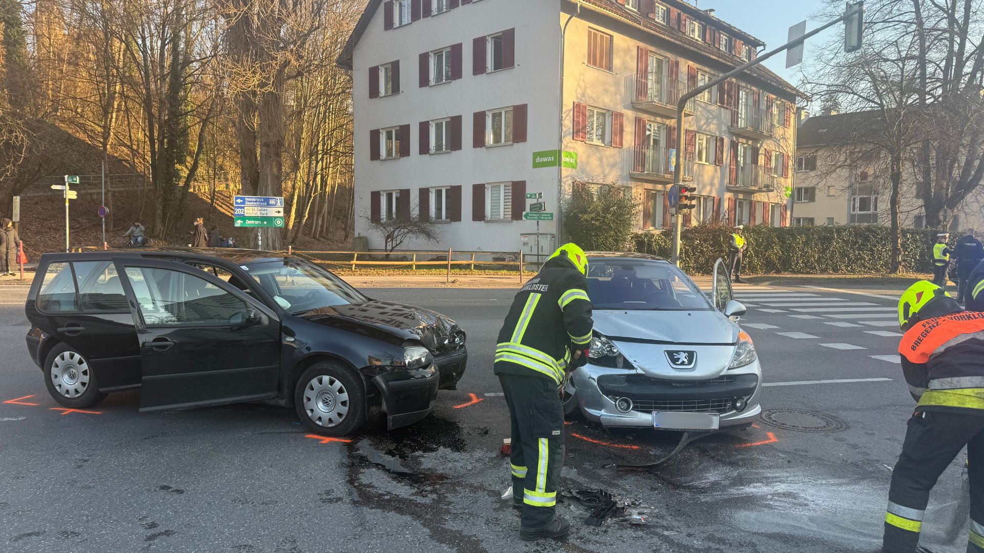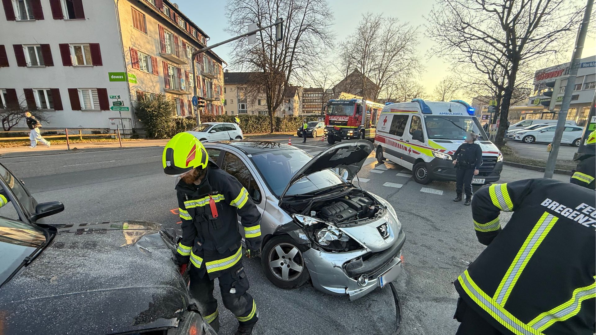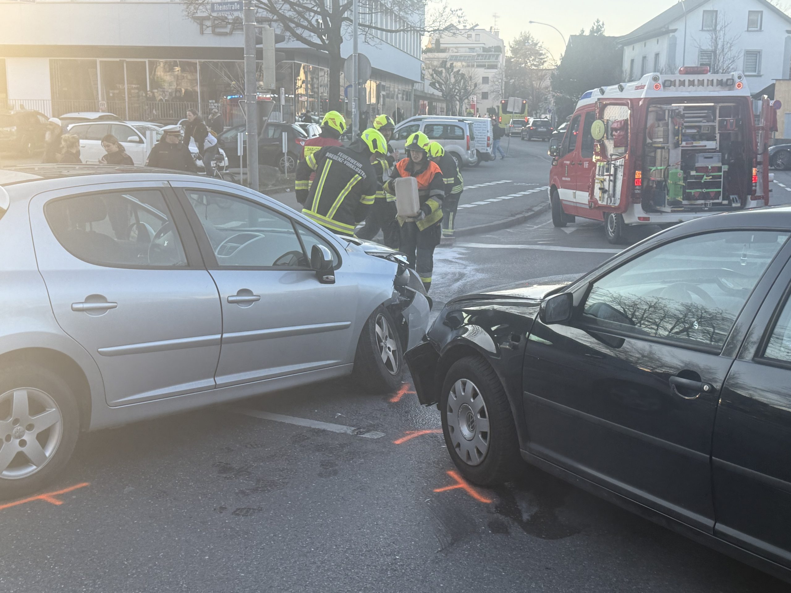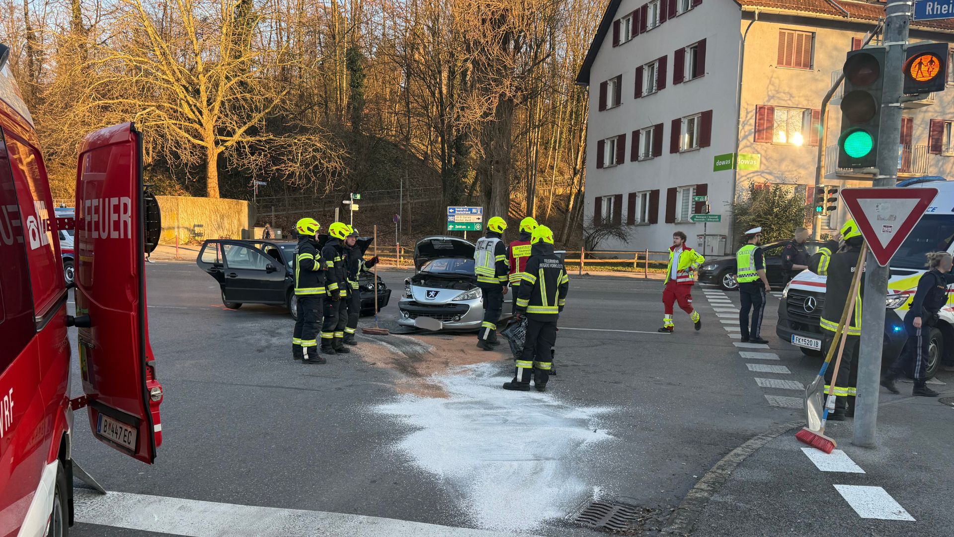 Bei dem Aufprall wurden beide Fahrzeuglenker verletzt. Zudem erlitten zwei Beifahrer des 23-Jährigen Verletzungen unbestimmten Grades. Alle vier Beteiligten wurden in das Landeskrankenhaus Bregenz sowie das Krankenhaus Dornbirn eingeliefert. An beiden Autos entstand erheblicher Sachschaden.