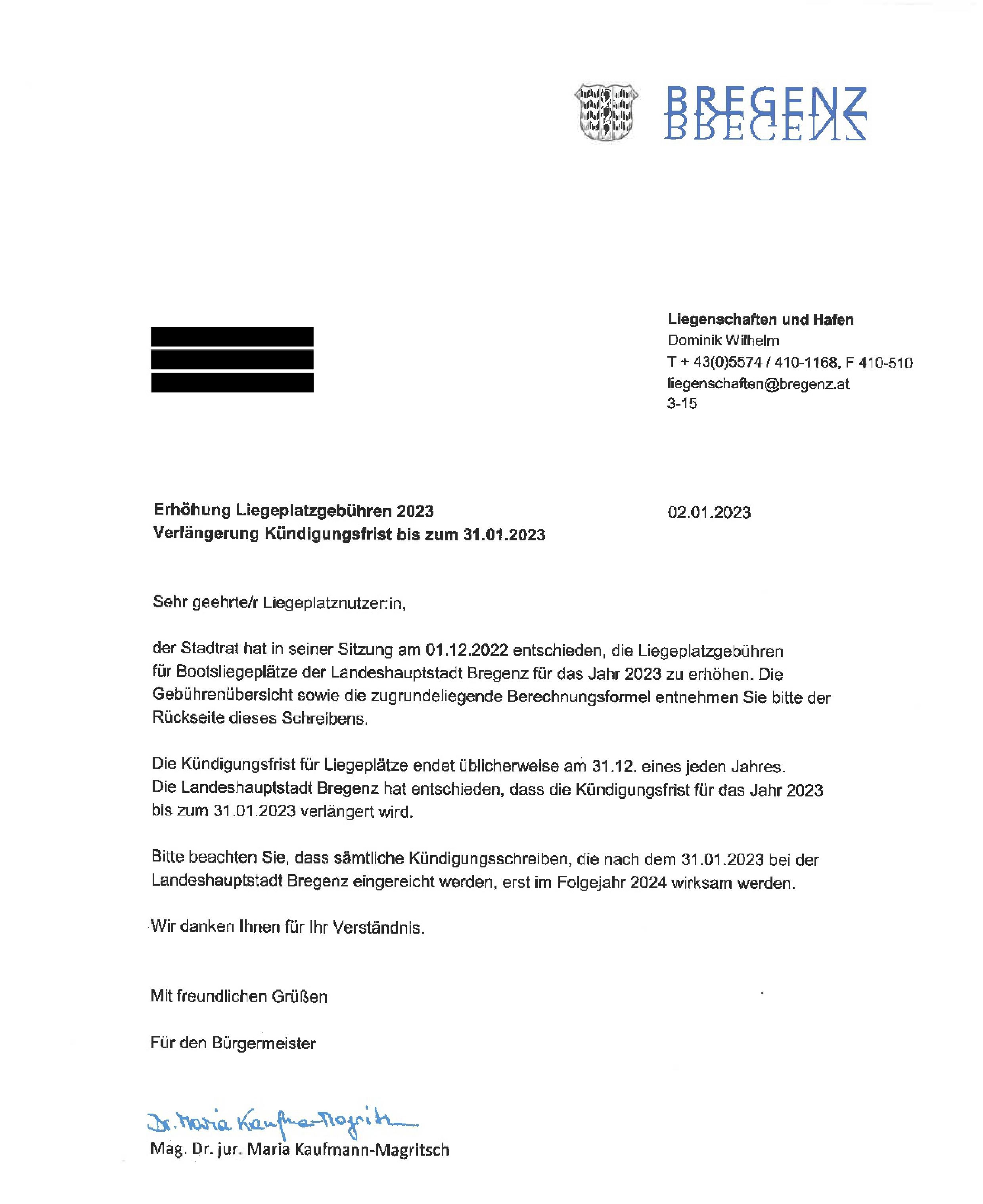 Laut der Stadt Bregenz kann ein Liegeplatz, nicht wie im anonymen Schreiben angeführt, grundlos entzogen werden. Dafür müssten folgende Gründe vorliegen: Wenn der Liegeplatz über die Saison hinweg nicht genutzt wird, das Entgelt trotz erfolgter Mahnung ausständig ist oder gegen die Hafenordnung, die Anweisungen der Hafenverwaltung oder der Hafenmeisterei verstoßen wird.