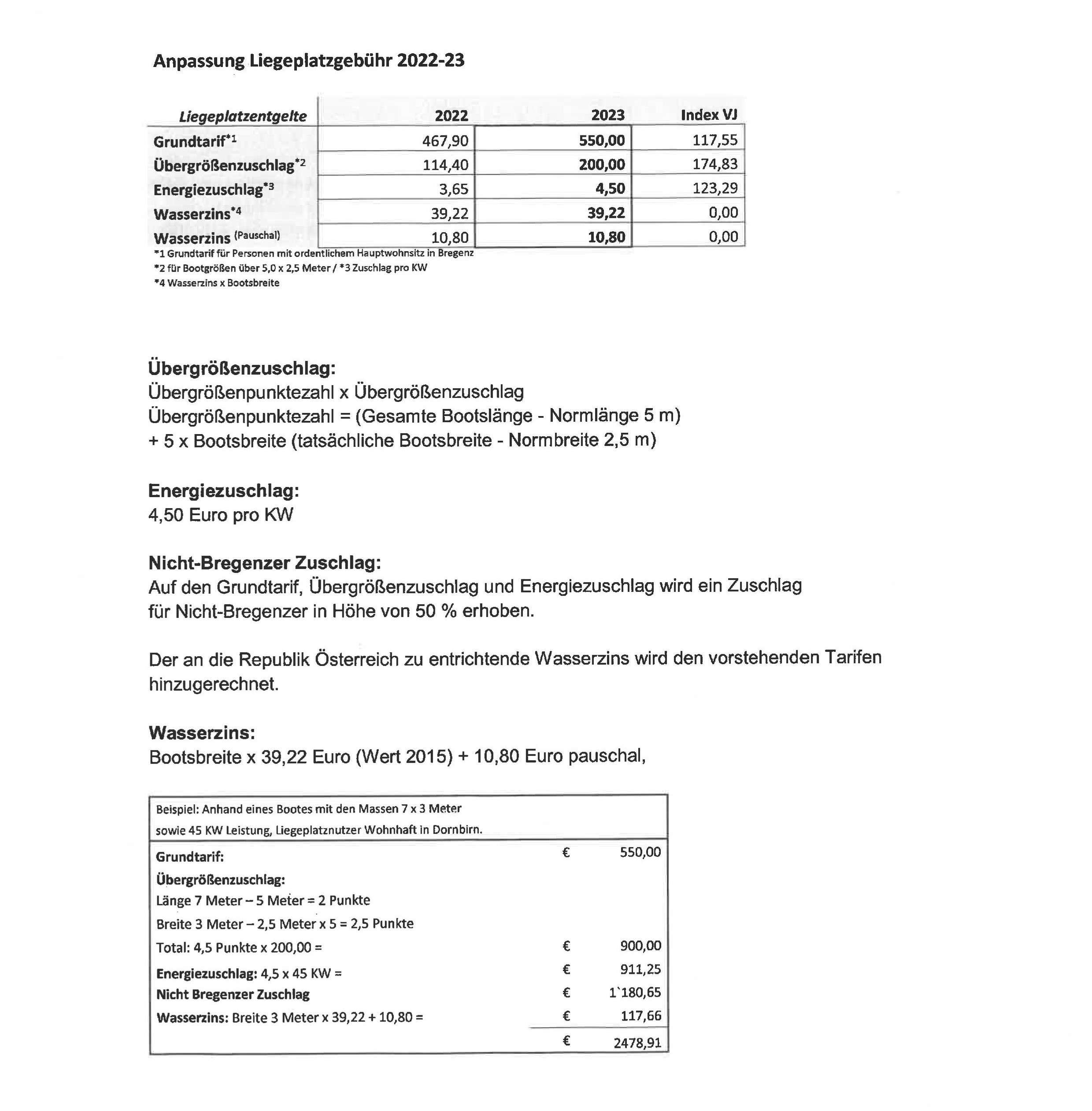 Bei diesem Betrag handelt es sich um einen Aufschlag für Bootsbesitzer, deren ordentlicher Wohnsitz sich nicht in der Landeshauptstadt befindet. Aufgeschlüsselt wird der Betrag mit einem Plus von 50 Prozent auf Grundtarif, Übergrößenzuschlag und Energiezuschlag. Seitens der Stadt heißt es, Bregenz biete, wie andere Kommunen auch, der Eigenbürgerschaft bestimmte Bevorzugungen. Auf Anfrage wird uns bestätigt, dass es auch in Hard einen Aufschlag für Liegeplatzbesitzer gibt, die nicht in der Bodenseegemeinde wohnen.