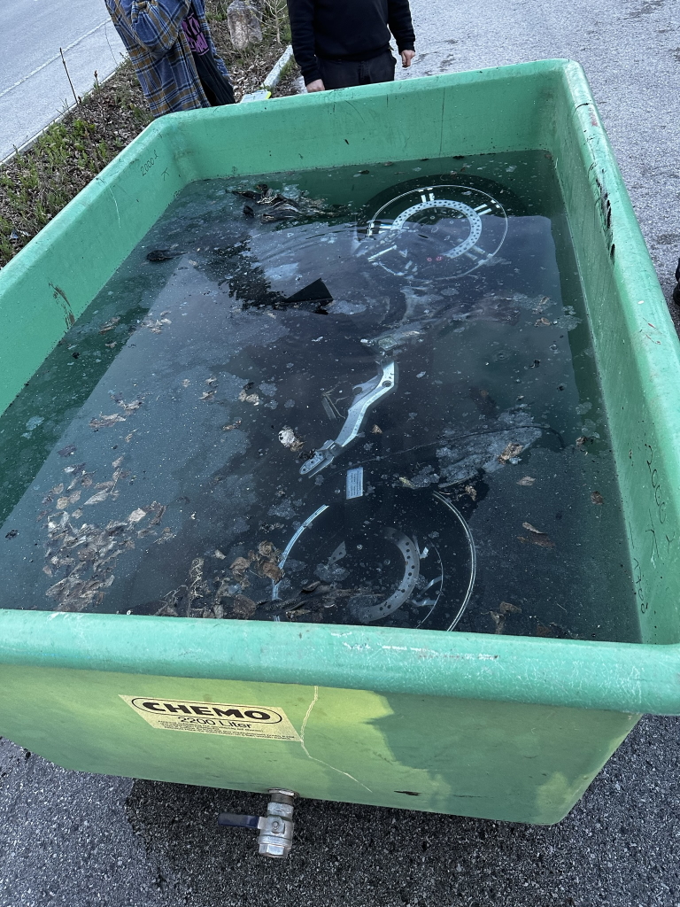 Außerhalb der Halle entzündete sich das Elektrofahrzeug mehrfach erneut und musste immer wieder gelöscht werden. Erst, nachdem das Motorrad in einer extra herangeschafften Wanne der Feuerwehr gänzlich im Wasser versenkt worden war, konnte der Brand nachhaltig gelöscht werden.