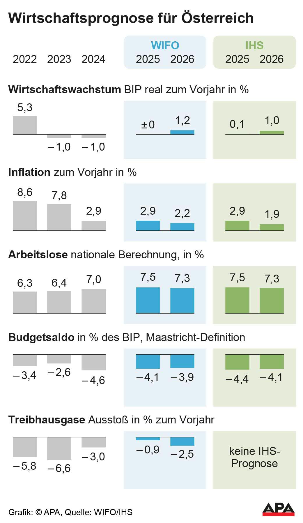 2026 soll die Wirtschaft dann etwas stärker wachsen. Das Wifo rechnet mit einer etwas dynamischeren Erholung auf 1,2 Prozent. Beim IHS geht man von einer Jahreswachstumsrate 2026 von einem Prozent aus. Damit bleibe Österreich klar hinter der erwarteten Entwicklung im Euro-Währungsraum zurück. Die IHS-Forscher prognostizieren für die 20 Euro-Länder ein reales Wachstum von 1,0 (2025) und dann 1,5 Prozent (2026). Beim Wifo beläuft sich die Schätzung hier auf 1,0 Prozent, gefolgt von 1,1 Prozent.