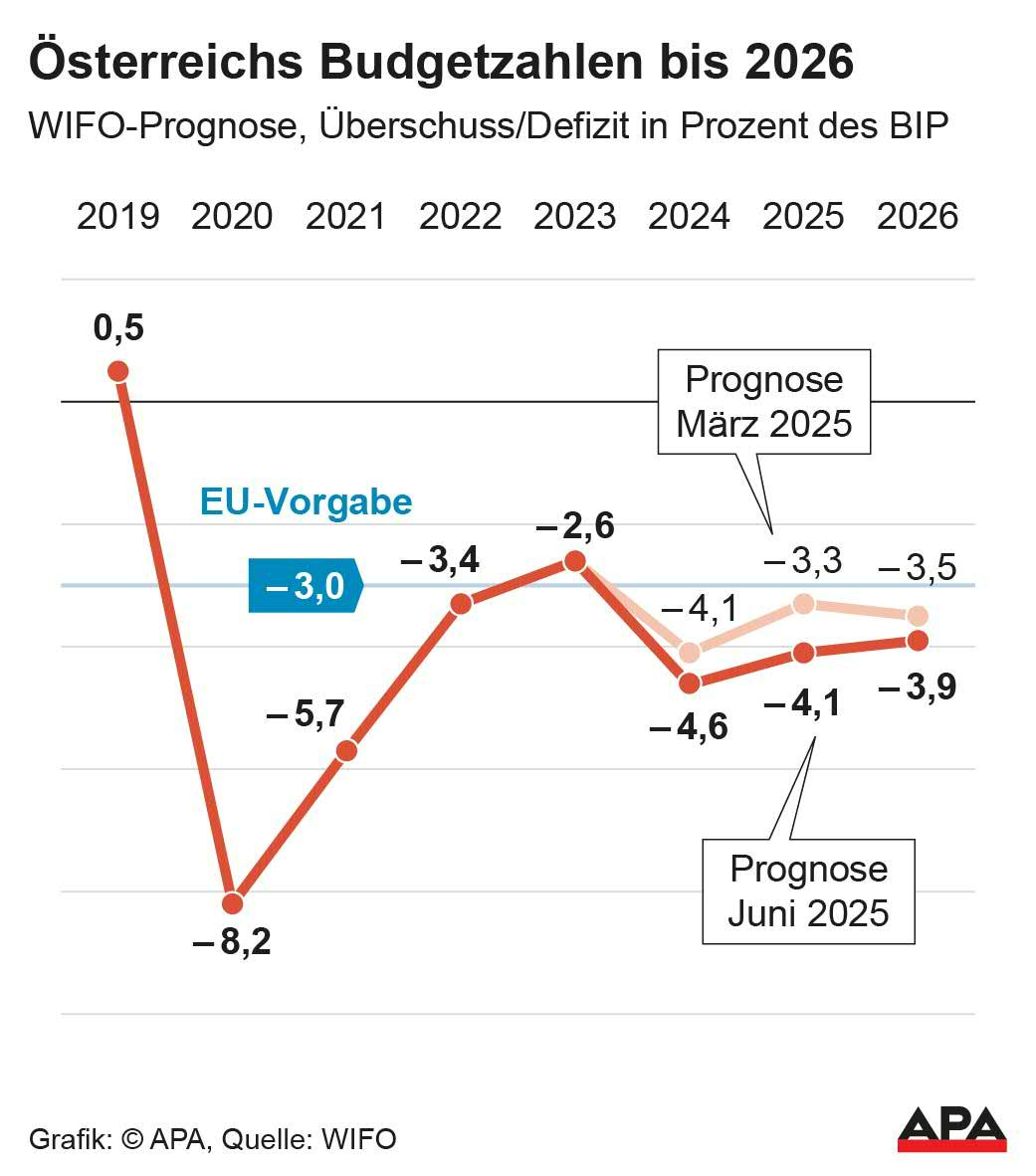 Das Budgetdefizit für 2025 soll mit 4,1 Prozent bzw. 4,4 Prozent trotz Sparpaket weiter deutlich über der Maastricht-Grenze von 3 Prozent des BIP liegen. Die Prognose für das Defizit wurde damit gegenüber dem Wert vom März, wo noch von 3,3 bzw. 3,2 Prozent ausgegangen wurde, verschärft. Das gilt auch für 2026, wo die Wirtschaftsforscher nun ein Haushaltsminus in Höhe von 3,9 bzw. 4,1 Prozent des Bruttoinlandprodukts (BIP) erwarten. Das IHS setzt bei seiner Prognose dabei eine "strikte Budgetdisziplin" voraus - also dass die Vorgaben des Sparpakets umgesetzt werden. Das Wifo rechnet bis 2026 mit einem Anstieg der Staatsschuldenquote auf 85 Prozent.
