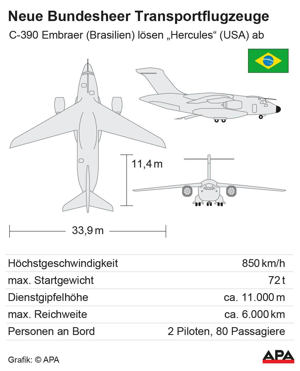 Noch nicht ganz klar ist, wie viele Maschinen angeschafft werden sollen. Seit Beginn der Planungen werde jedoch von rund vier Maschinen gesprochen, in diese Richtung werde man sich weiter bewegen, sagte Tanner. Der Stückpreis würde zwischen 130 und 150 Millionen Euro liegen. Die Embraer C-390 sei etwa in der Lage, einen Radpanzer Pandur Evo mit aufgebauter Waffenstation und auch einen S-70 "Black Hawk"-Hubschrauber in den Einsatzraum zu bringen, beschrieb Rüstungsdirektor Generalmajor Harald Vodosek die Vorzüge der Maschine.