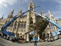 Das Aufstellen des Christbaums dauerte wesentlich kürzer: Um 10.00 Uhr karrte der Tieflader die mächtige Fichte unter Polizeigeleit auf den Rathausplatz. Danach wurden rund 500 Laufmeter Seil, mit dem die Äste für den Transport zusammengezurrt worden waren, entfernt und der Baum mittels zweier Kräne in die Senkrechte gebracht. Nach gut 30 Minuten konnte die Fichte schließlich in die vorgesehene Öffnung gestellt werden.