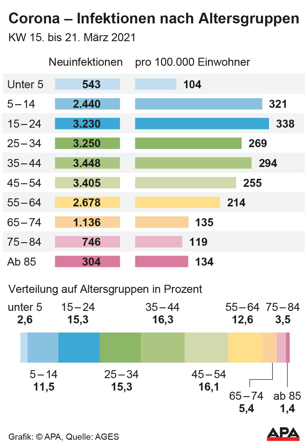Die Zahlen der Agentur für Gesundheit und Ernährungssicherheit (AGES) für die Kalenderwoche elf (15. bis 21. März) zeigen, dass knapp 30 Prozent der insgesamt 21.880 Personen, die sich in der vergangenen Woche mit dem Coronavirus infiziert haben, noch keine 25 Jahre alt sind.