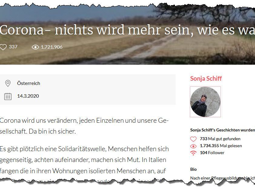 "Corona bringt das Leben irgendwie auf den Punkt", meint die Gerontologin Schiff, Gründerin von Care.Consulting, in dem am 14. März geposteten Beitrag. "Mein Hoffnung ist groß, dass wir uns dann (am Ende der Krise, Anm.) auch jenen Menschen gegenüber solidarisch zeigen, die uns schon seit Jahren um Hilfe anflehen: Menschen in Not, egal welcher Art von Not und woher sie kommen." Diese Hoffnung wird allerdings offenbar von nicht sehr vielen Lesern geteilt: Sonntagmittag waren gerade 337 Likes für die Geschichte registriert.
