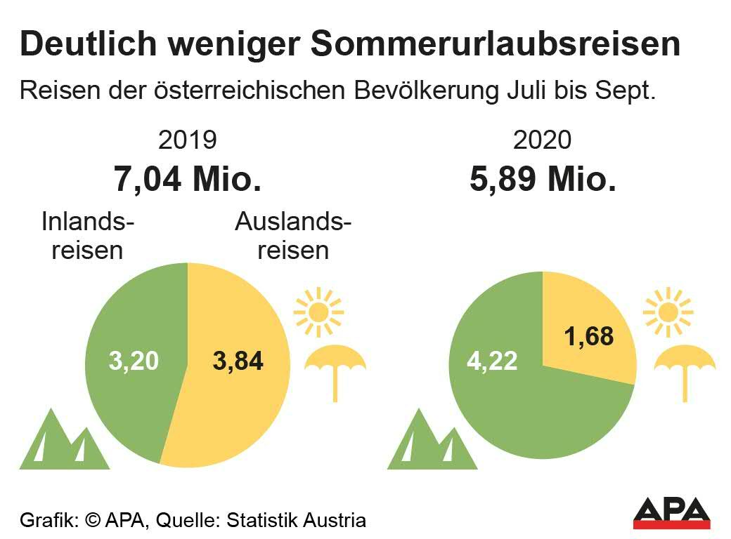 Die Zahl der Urlaubsreisen ging damit von 7 auf 5,9 Millionen zurück und jene der Reisenden um ein Fünftel (-20,6 Prozent) auf 3,4 Millionen. Inlandsreisen stiegen aber stark an, so die Statistik Austria.