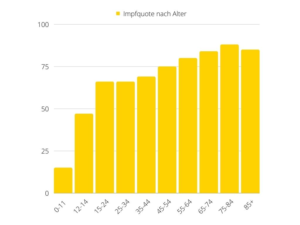 Die vulnerabler Gruppe der 65- bis 74-Jährigen weisen jedoch eine Quote von 83,7 Prozent auf, die 75- bis 84-Jährigen 88,1 Prozent und die Gruppe 85plus 85,1 Prozent. Für Kinder bis elf Jahre werden 14,6 Prozent ausgewiesen. Am höchsten ist die Schutzrate (gültiges Impfzertifikat) weiterhin im Burgenland mit 74,3 Prozent, Oberösterreich bleibt das Schlusslicht mit 63,7 Prozent.