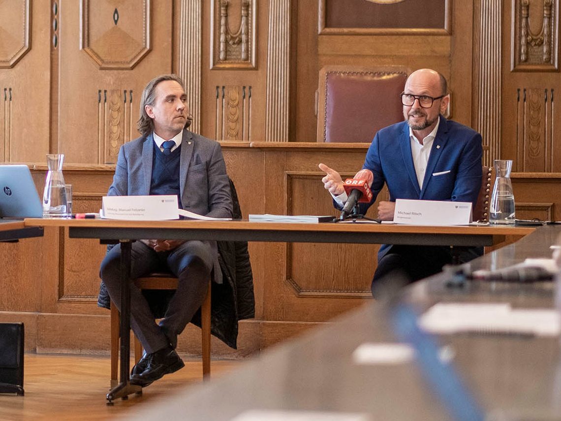 Wie geht es der Landeshauptstadt finanziell? Bürgermeister Michael Ritsch und Stadtkämmerer Manuel Felizeter präsentieren am Montag im Rathaus das Bregenzer Rechnungsergebnis für das vergangene Jahr. Auf den ersten Blick zeigt sich dabei eine leichte Verbesserung der Finanzgebarung. So war der Haushalt 2020 trotz Covid-19 sogar geringfügig positiv. Es musste also kein Netto-Defizit in die Bücher geschrieben werden. Auch der Schuldenstand der Stadt sank gegenüber 2019 ein wenig.