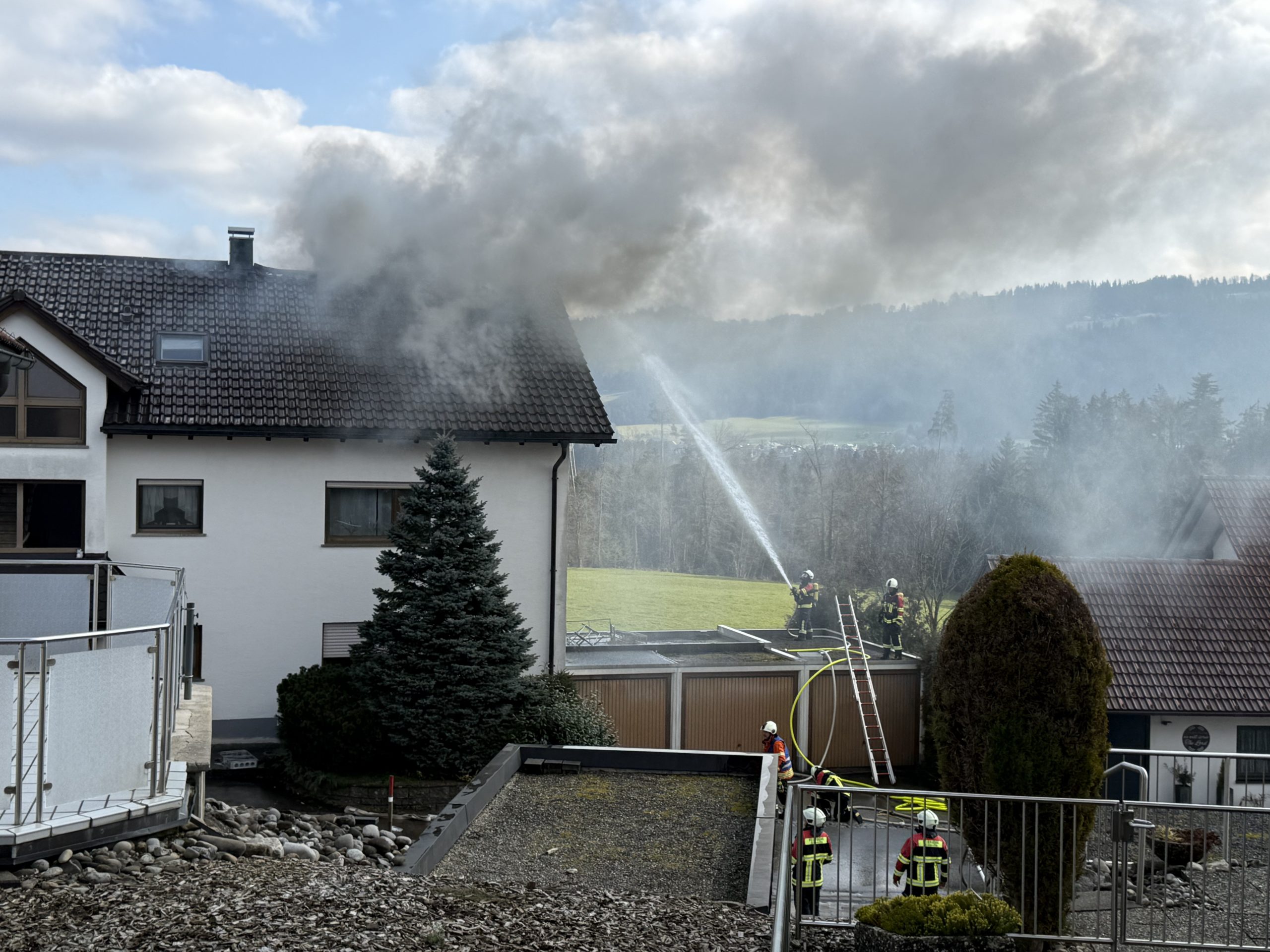 Am Samstagvormittag brach in einem Mehrfamilienhaus in Sigmarszell ein Brand aus. Das Feuer entstand ersten Angaben zufolge im Obergeschoss und griff rasch auf den Dachstuhl über.