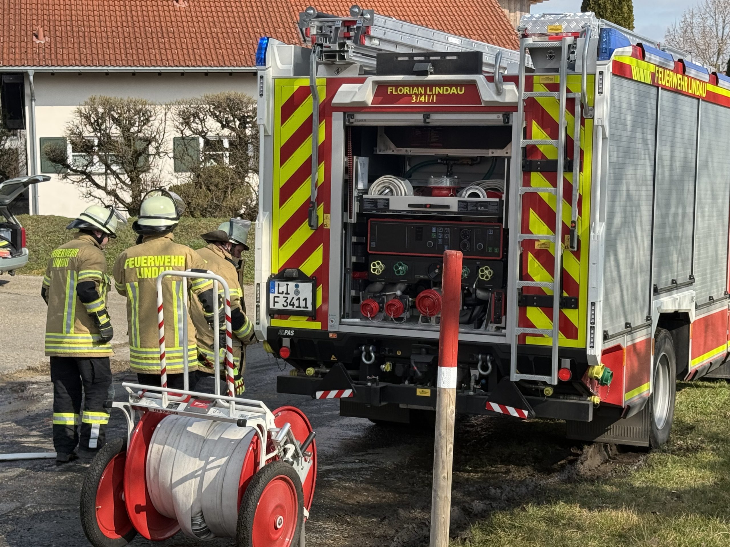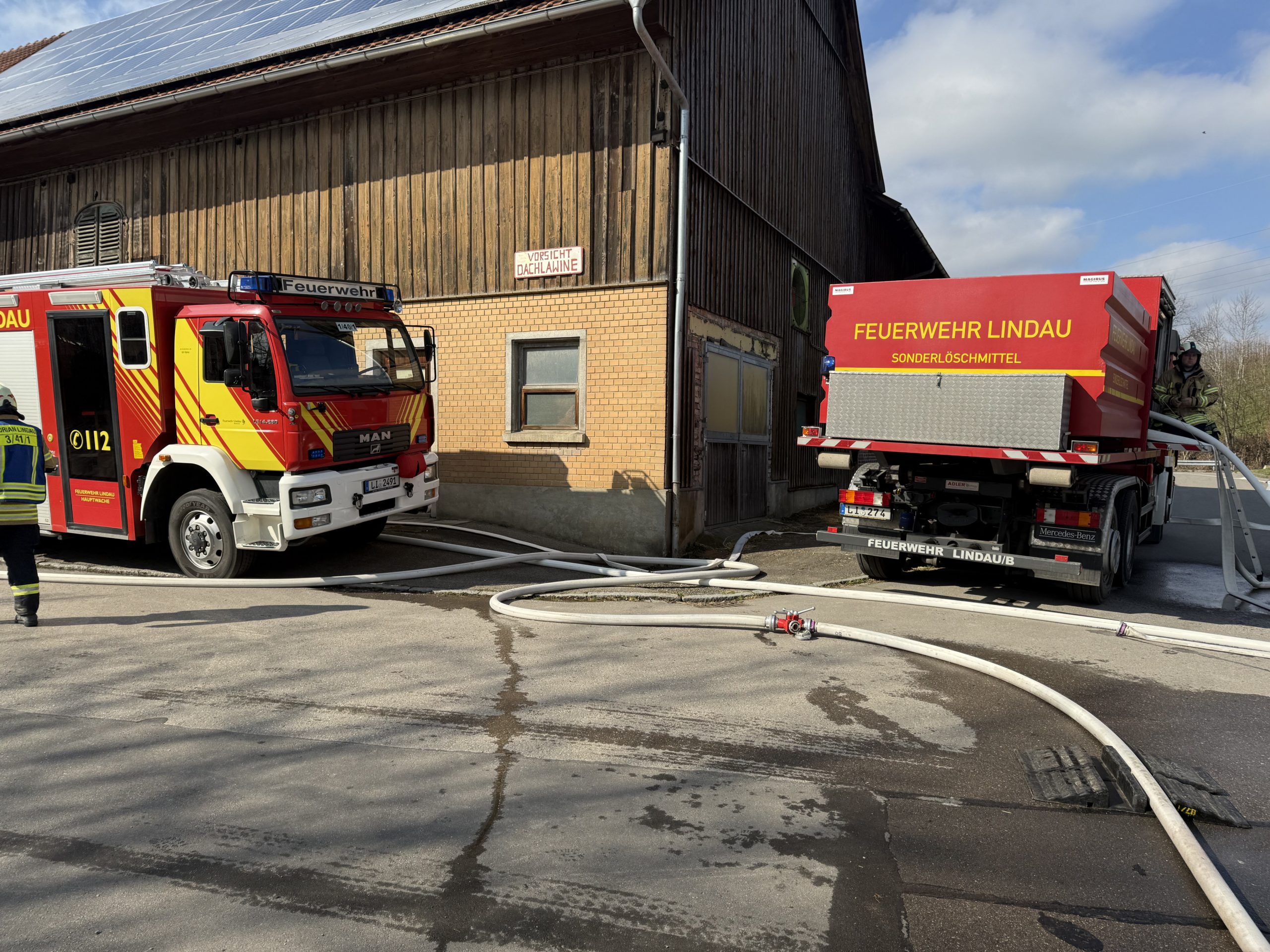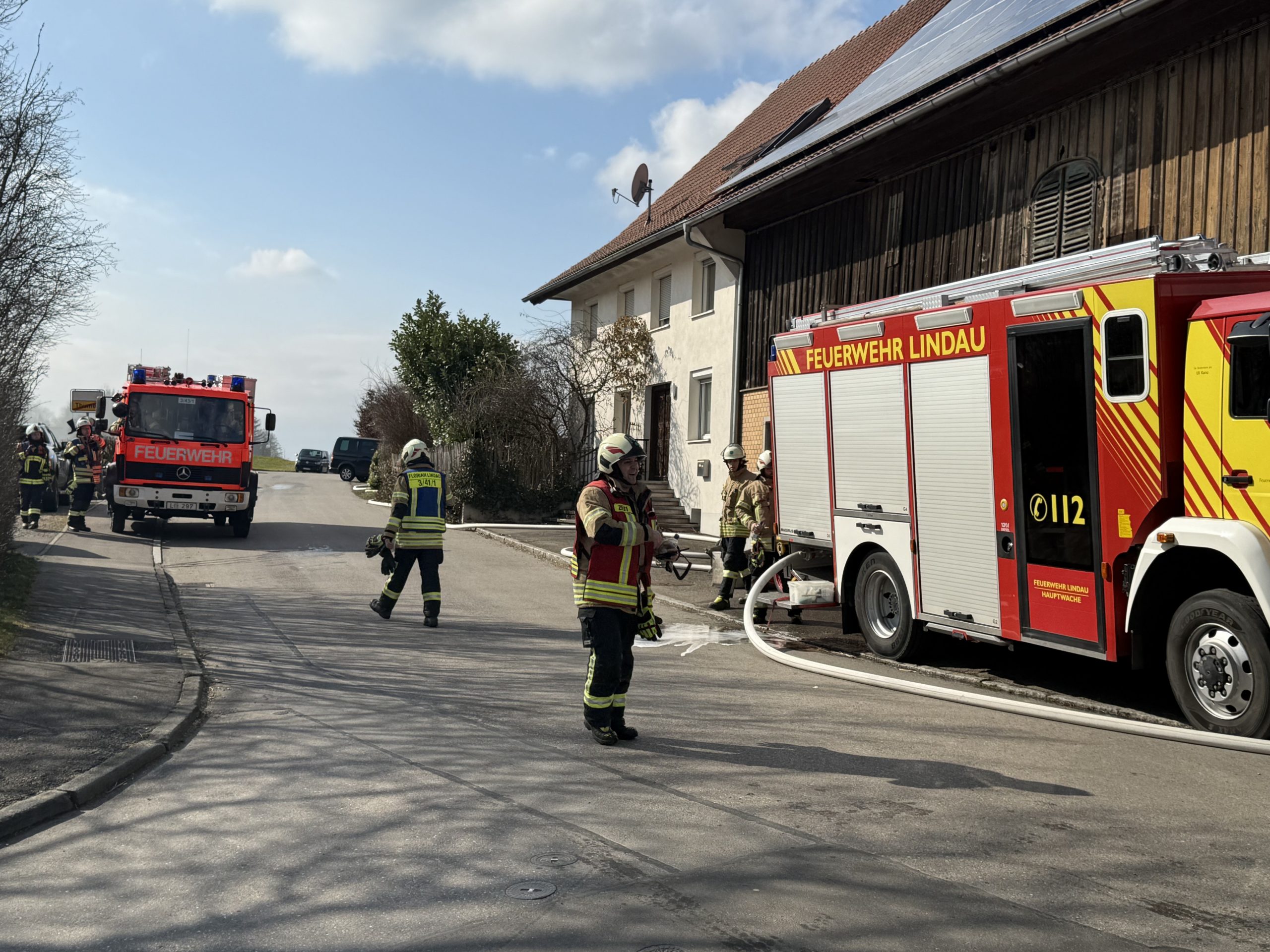 Die Feuerwehren aus dem Löschkreis Lindau rückten mit einem Großaufgebot an. Mehr als 100 Einsatzkräfte kämpften gegen die Flammen. Aufgrund eines Zusammenbruchs der Löschwasserversorgung musste eine Wasserleitung über eine Straßenkreuzung gelegt werden, weshalb die B308 zeitweise gesperrt wurde.