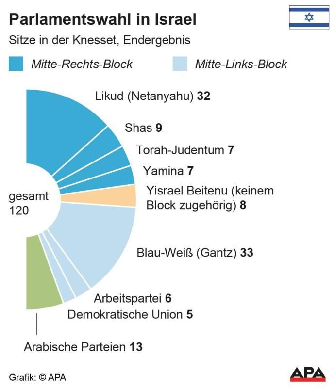 Um die Macht ringen der Likud des amtierenden konservativen Ministerpräsidenten Benjamin Netanyahu und das zentristische Bündnis Blau-Weiß des Ex-Generals Benny Gantz.