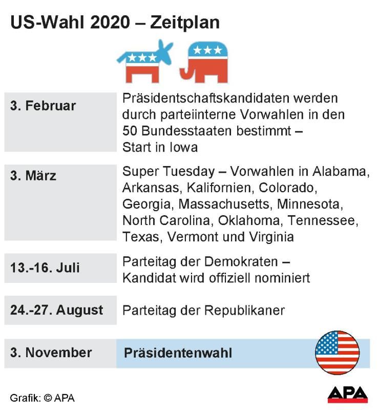 Im Rennen um die demokratische Präsidentschaftskandidatur dürfte schon am 3. März eine Vorentscheidung fallen. Am "Super Tuesday" wählen nämlich zwölf Bundesstaaten, darunter der bevölkerungsreichste Kalifornien. Die letzten Vorwahlen finden Anfang Juni statt, Mitte Juli steigt in Milwaukee der Nominierungsparteitag der Demokraten. Ende August wollen die Republikaner Trump auf den Schild heben, womit das Duell um das Weiße Haus eröffnet ist.