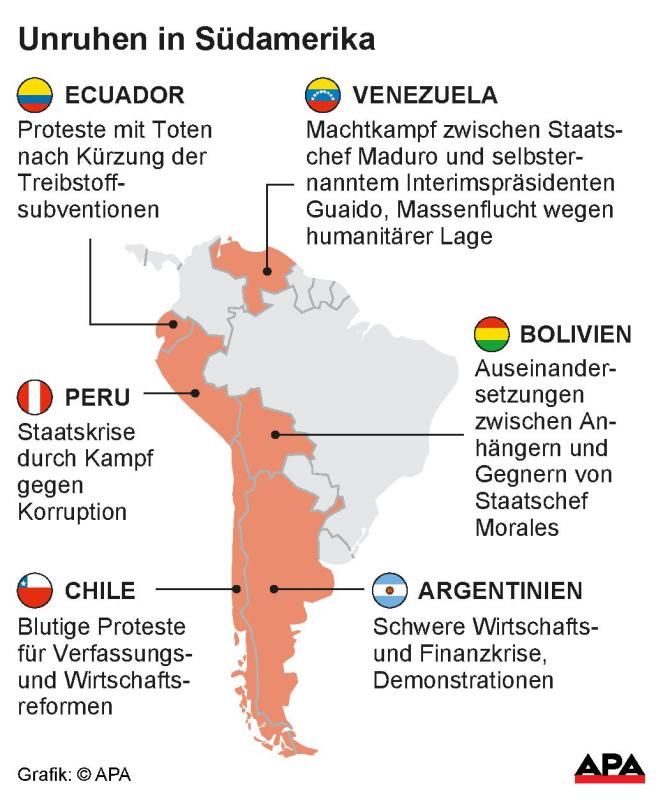 In südamerikanischen Peru sollen im Jänner vorgezogene Parlamentswahlen einen Weg aus der Staatskrise weisen, doch könnte sich der Konflikt zwischen Präsident Martin Vizcarra und der von Keiko Fujimori angeführten "Fuerza Popular" (Volkskraft) noch weiter aufheizen. Wahlen werden wohl auch in Bolivien stattfinden, wo ein Showdown zwischen den Gegnern und Unterstützern des ins Exil getriebenen Präsidenten Evo Morales erwartet wird. Ein entscheidendes Jahr kommt auch auf Venezuela zu, wo im Dezember das von der Opposition beherrschte Parlament neu gewählt wird. Dessen Vorsitzender Juan Guaido hat sich heuer zum neuen Präsidenten des Landes ausgerufen, doch kontrolliert der sozialistische Staatschef Nicolas Maduro weiter die Machtmittel.