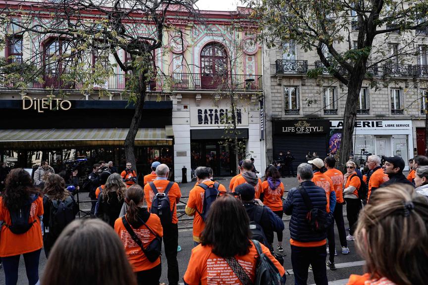 Teilnehmende bleiben vor dem Konzertsaal Bataclan stehen, während sie an der "Marche de la liberté" (Marsch für die Freiheit) teilnehmen, um den Opfern der Terroranschläge vom 13. November 2015 in Paris zu gedenken.