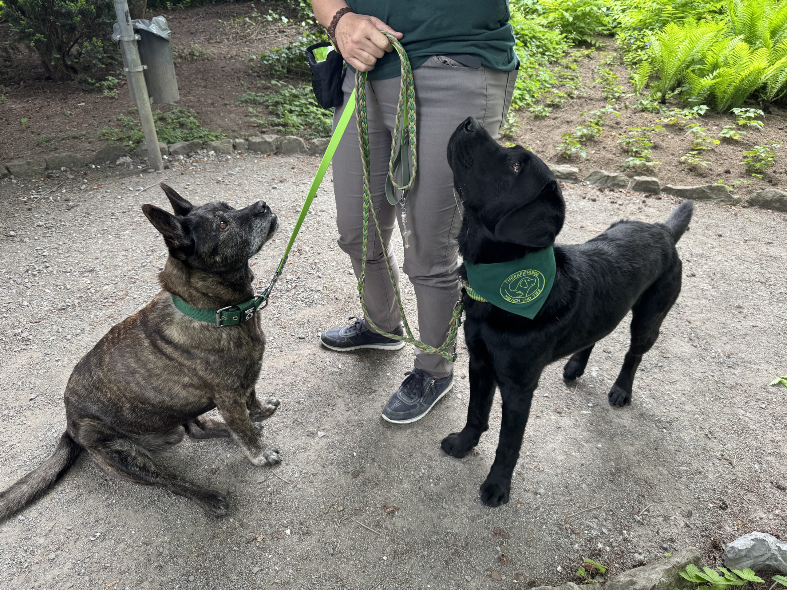 Doris strahlt, wenn sie von ihren Hunden spricht. "Der Luis ist seit zwei Jahren in Pension", sagt sie mit einem liebevollen Blick auf den 14-jährigen Senior. "Er war lange als Therapiebegleithund im Einsatz, besonders bei älteren Menschen. Jetzt genießt er seinen Ruhestand – er hört kaum mehr, ist ein bisschen dement, aber wir machen das Beste draus." Neben ihr Jüngling Emil: "Er ist seit vergangenem Jahr im Einsatz. Wir besuchen mit ihm Seniorenheime, Menschen mit Demenz, Kinder – und haben viel Spaß dabei!"