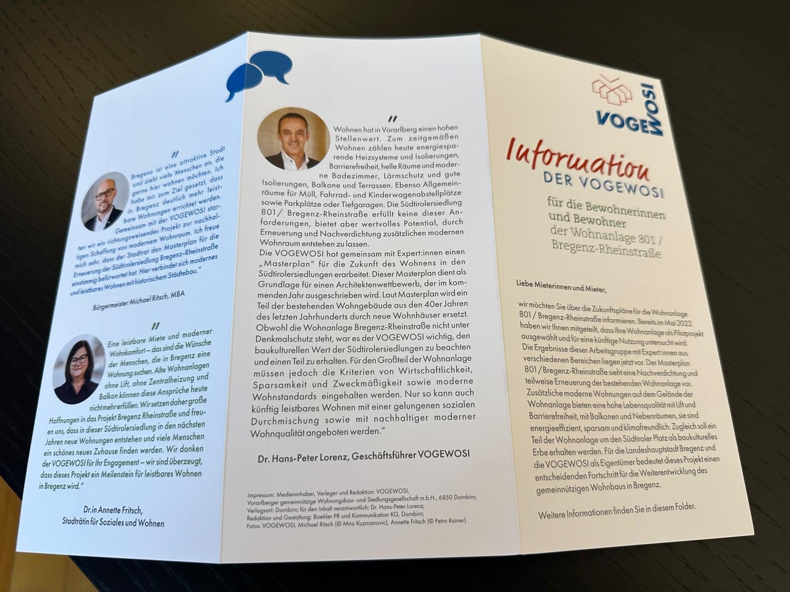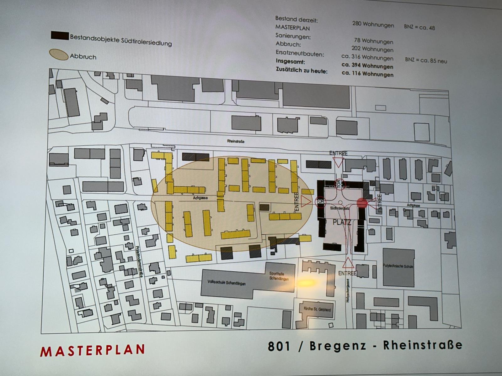 Bereits im Mai 2022 wurde die Südtirolersiedlung an der Rheinstraße in Bregenz für einen interdisziplinären Prozess ausgewählt. Die Anforderungen und Bedürfnisse an das Wohnen hätten sich in den vergangenen Jahrzehnten verändert, informierte die Vogewosi damals die Bewohner. Man suchte daher mit Experten nach Ideen für die Zukunft des Wohnens in den Südtirolersiedlungen. Die Ergebnisse sind im sogenannten "Masterplan 801/Bregenz-Rheinstraße" zusammengefasst. Durch Nachverdichtung und teilweise Erneuerung sollen moderne, energieeffiziente und leistbare Wohnungen geschaffen werden. Ein Teil der Wohnanlage bleibt als baukulturelles Erbe erhalten.