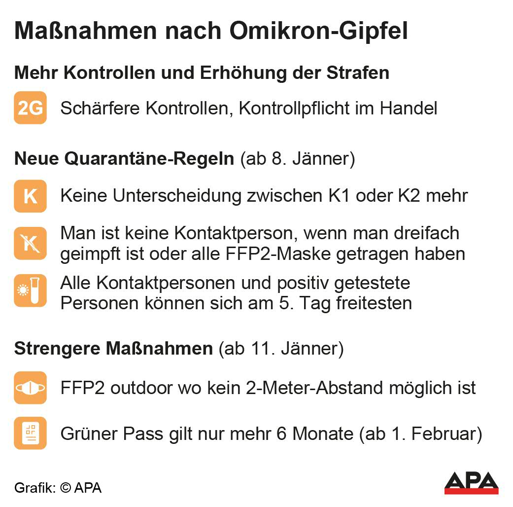 Der Krisengipfel der Bundesregierung mit Vertretern der Länder und Experten der "gesamtstaatlichen Covid-Krisenkoordination" (Gecko) hat am Dreikönigstag neue Maßnahmen gebracht. Künftig gilt eine FFP2-Maskenpflicht im Freien bei Unterschreitung des Zwei-Meter-Abstands, zudem soll die Quarantäne für Kontaktpersonen verkürzt und der Kontrolldruck im Handel erhöht werden, erklärten ÖVP-Bundeskanzler Karl Nehammer und Gesundheitsminister Wolfgang Mückstein (Grüne) im Anschluss.