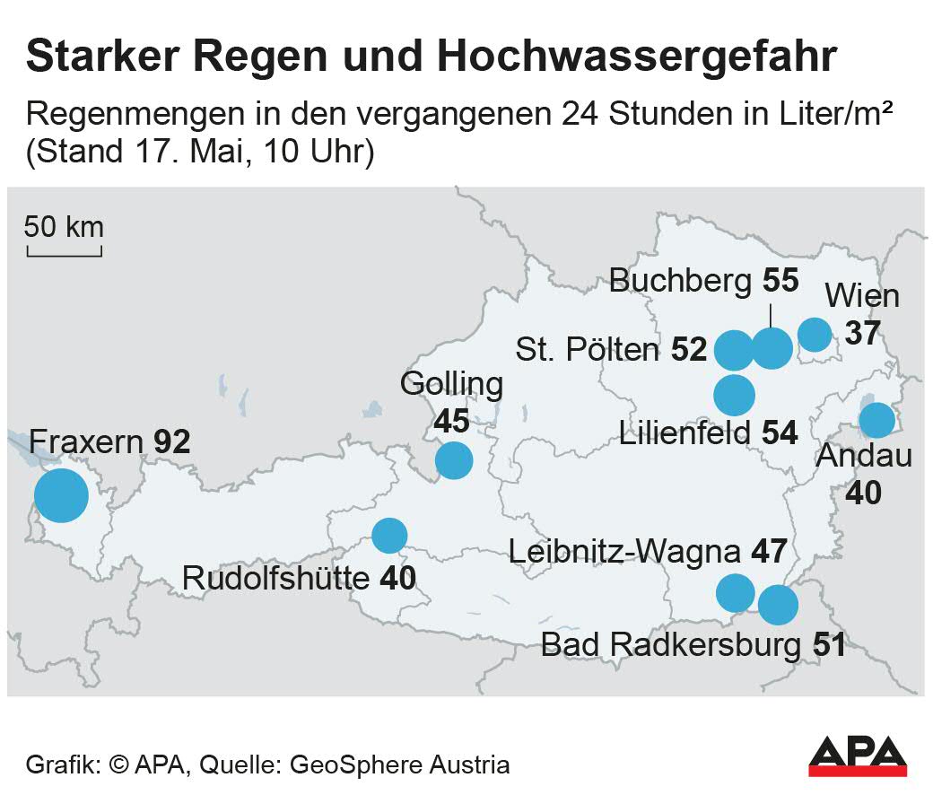 "Um die 50 Millimeter hat es in den letzten 24 Stunden zum Beispiel in Niederösterreich in St. Pölten, Lilienfeld und Langenlebarn geregnet und in der Steiermark in Bad Radkersburg und Leibnitz", erläuterte Alexander Orlik, Klimatologe bei Geosphere Austria. "So viel Regen in 24 Stunden gibt es in diesen Regionen durchschnittlich alle drei bis vier Jahre, meist in den Sommermonaten. In einem Mai sind derartige Regenmengen deutlich seltener und kommen nur alle zehn bis 20 Jahre vor", betonte der Experte.