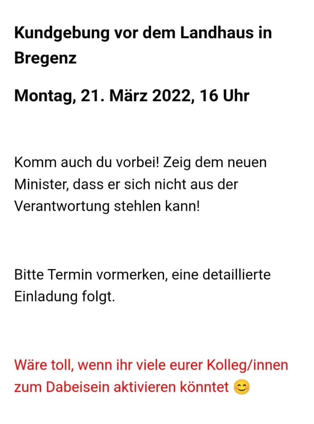 Rund 1.000 Mitarbeiter öffentlicher elementarer Bildungseinrichtungen hatten am 14. Oktober vor dem Bildungsministerium am Wiener Minoritenplatz - damals unter Ressortchef Heinz Faßmann (ÖVP) - mit Trommeln und Klatschfächern lautstark bessere Rahmenbedingungen für ihre Arbeit eingefordert. Am kommenden Montag soll nun zwischen 8.30 und 10.30 Uhr der aktuelle Bildungsminister Martin Polaschek (ÖVP) an die Forderung nach einem Bundesrahmengesetz, mehr Geld und Personal erinnert werden. In Vorarlberg findet die Kundgebung um 16 Uhr vor dem Landhaus in Bregenz statt.