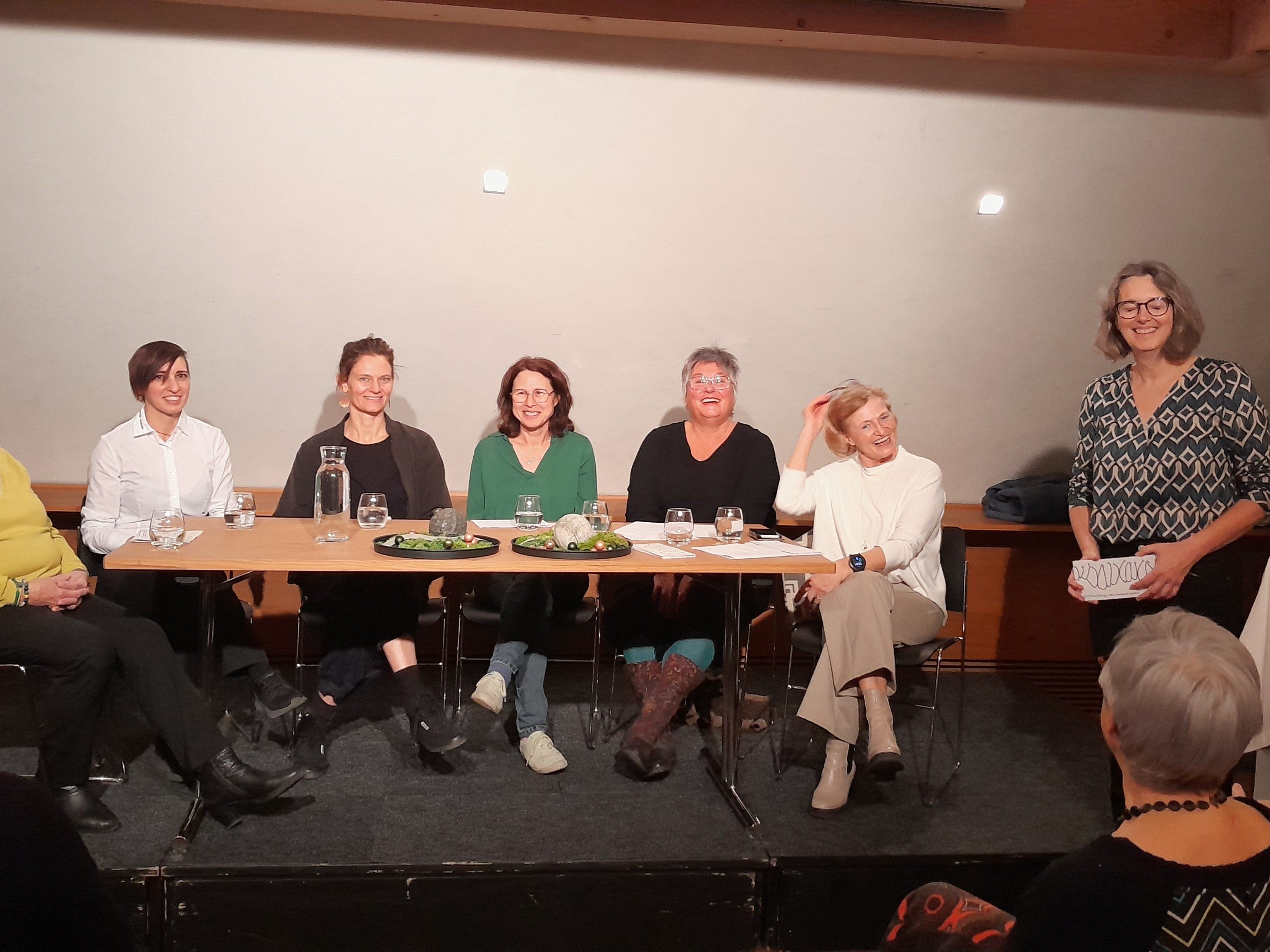 Nach der Begrüßung durch Marion Peter – und einem soziokulturellen und geschichtlichen Input zum Thema Frauen in der Sterbebegleitung durch Eva Häfele – übernahmen Katharina Waibel und Angela Jäger die Moderation und führten durch den Abend mit Roswitha Jussel (Psychotherapeutin i.P.), Fabienne Gächter (Bestatterin), Theresa Häfele (Architektin, ehrenamtliche Hospizbegleiterin) und Heidi Schädler (dipl. GKP, Schwerpunkt Palliativpflege).