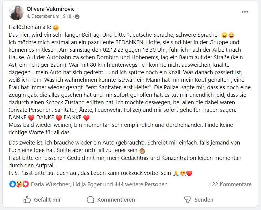 Den 2. Dezember 2023 wird Olivera Vukmirovic aus Rankweil so schnell nicht mehr vergessen. Die 47-jährige Verkäuferin war auf dem Nachhauseweg nach der Arbeit von Dornbirn aus unterwegs. Gegen 18:30 Uhr kam es schließlich zu einem Unglück: Auf der A14 zwischen Dornbirn und Hohenems lag ein Baum auf der Straße. Olivera konnte nicht ausweichen und prallte dagegen.