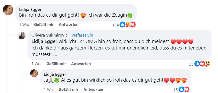 "Ich wäre natürlich in der Situation auch froh gewesen, wenn sie jetzt zum beispiel einfach stehen geblieben wäre", meint Lidija. Heutzutage sei es für die meisten Menschen nicht mehr so normal, einfach zu helfen. "Der Anblick, als ich sie gesehen habe, das war wirklich ganz schlimm." Deswegen sei sie auch froh gewesen, als sie Oliveras Posting in sozialen Medien entdeckt habe. "Oh mein Gott. Es geht ihr gut", habe sie gedacht. Sie habe zuvor nicht einmal gewusst, wie sie heiße. "Ich möchte mich wirklich bei allen bedanken", verdeutlicht Olivera gegenüber VOL.AT. Auch bei ihrem Kollegen, der sie im Spital besucht habe und ihr geholfen habe. "Er hat auch alles organisiert. Hat mich abgeholt", meint sie. Auch bei allen Einsatzkräften, Helfern und ihren Nachbarn, die für sie Besorgungen erledigen und für sie da sind, möchte sie sich bedanken. Oliveras Dank gilt zudem auch allen Usern, die ihren Beitrag in sozialen Medien kommentiert und sie kontaktiert haben. "Sie waren wirklich herzlich und hilfsbereit. Da war kein einziger negativer Kommentar mit dabei", verdeutlicht sie.