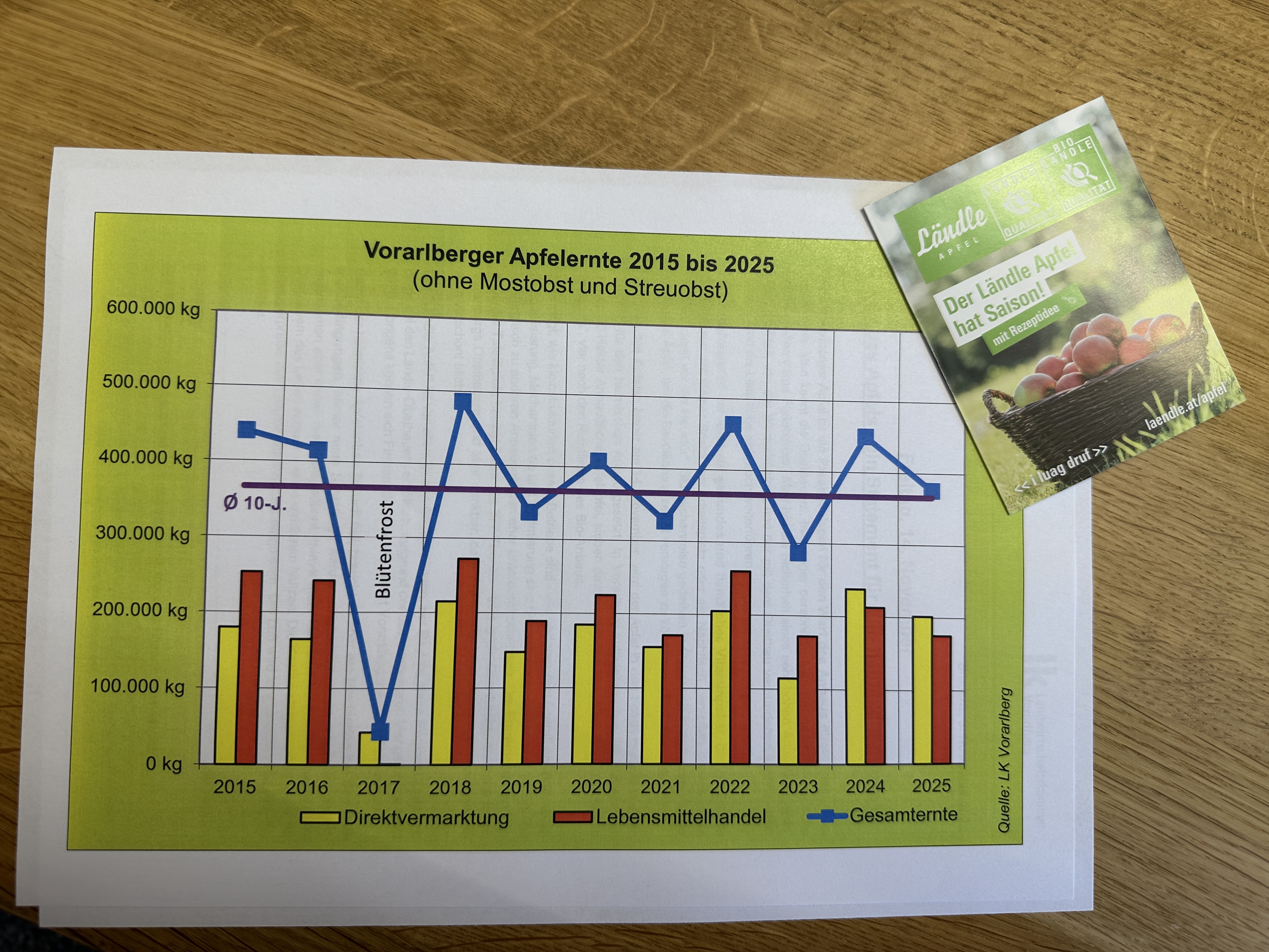 In Vorarlberg bewirtschaften rund 30 Betriebe etwa 30 Hektar Anbaufläche Tafeläpfel nach den Richtlinien des "Ländle Gütesiegels" oder in Bio-Qualität. Insgesamt wurden heuer gut 377 Tonnen an Tafeläpfeln geerntet. Aus Sicht der Landwirtschaftskammer ist das leicht überdurchschnittlich. Jens Blum ist Obstbauer im Haupterwerb. "Wir haben ungefähr 250 Tonnen, die wir ernten", verrät er. Die größere Menge gelangt über Spar zu den Konsumenten, ein Teil aber auch ab Hof. Die Mitarbeitersituation für die Apfelernte sei heuer gut gewesen: "Dieses Jahr hat es gut funktioniert. Aber es ist immer wieder eine Herausforderung."