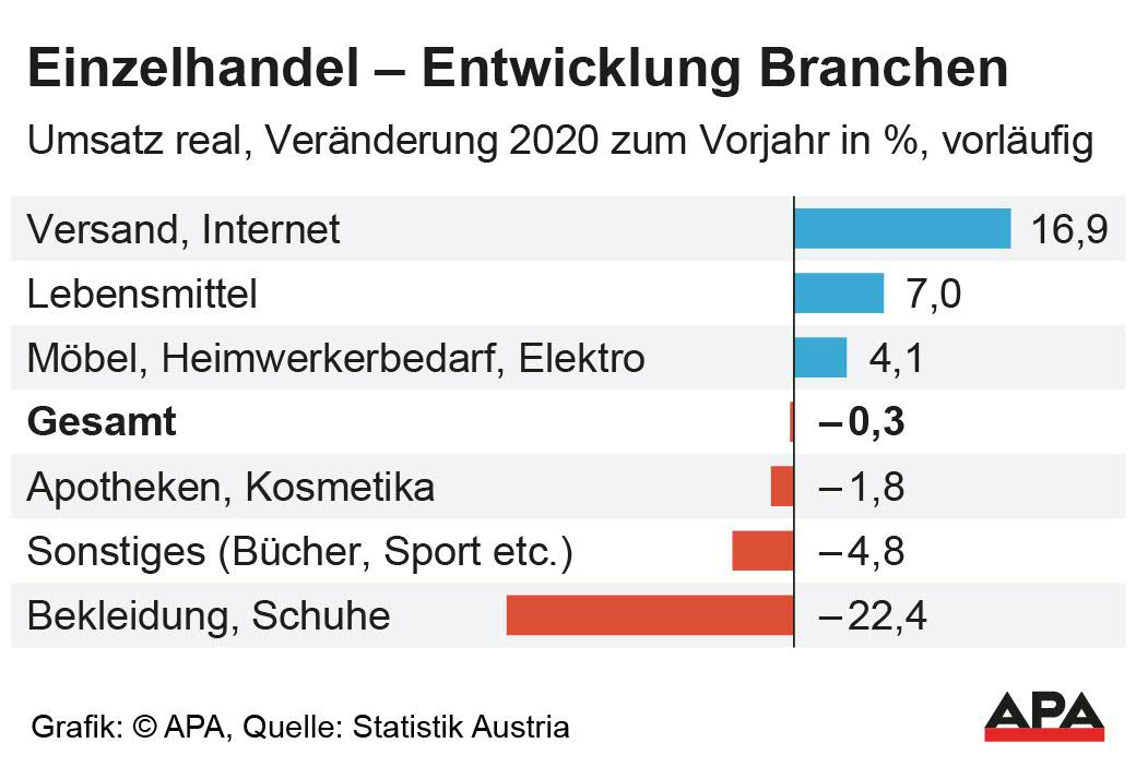 Die Coronakrise hat den österreichischen Einzelhandel im vergangenen Jahr zweigeteilt. Führten Lockdown, Homeoffice und geschlossene Restaurants dazu, dass die Menschen deutlich mehr im Supermarkt einkauften oder online bestellten, hatten die Maßnahmen in anderen Branchen des Handels genau den gegenteiligen Effekt. Kleidung oder Schuhe blieben wie Blei in den Regalen liegen.